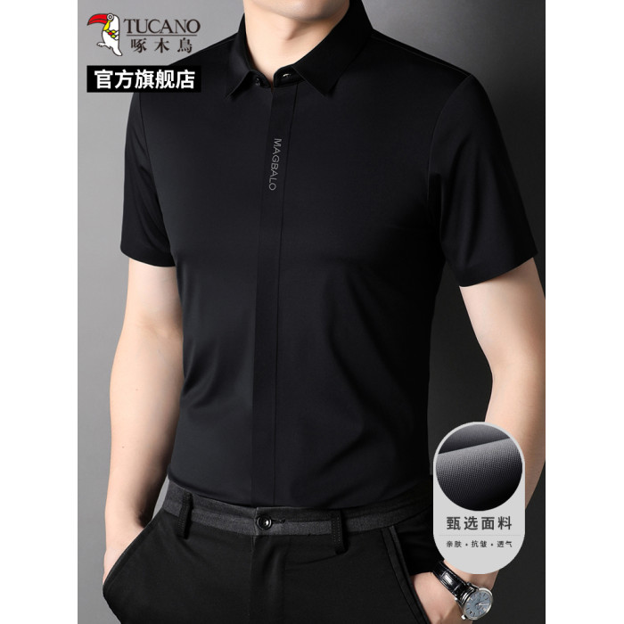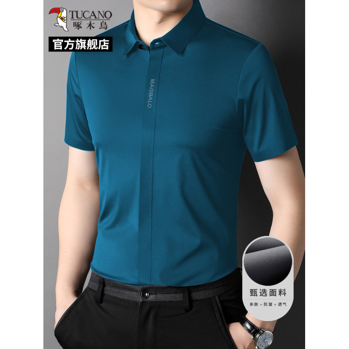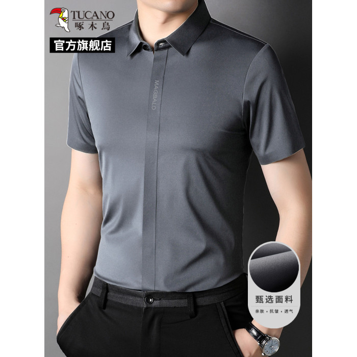 啄木鳥無痕冰絲短袖襯衫男士夏季商務休閒襯衣抗皺親膚透氣上衣C