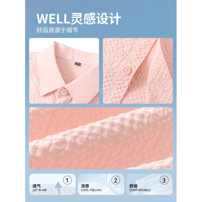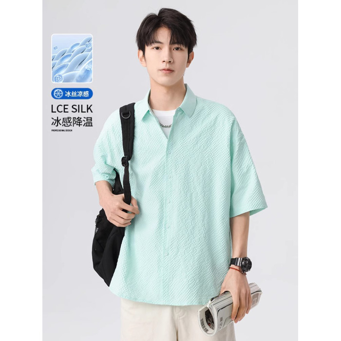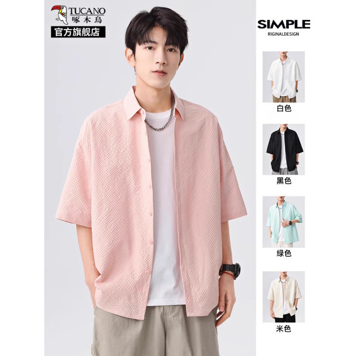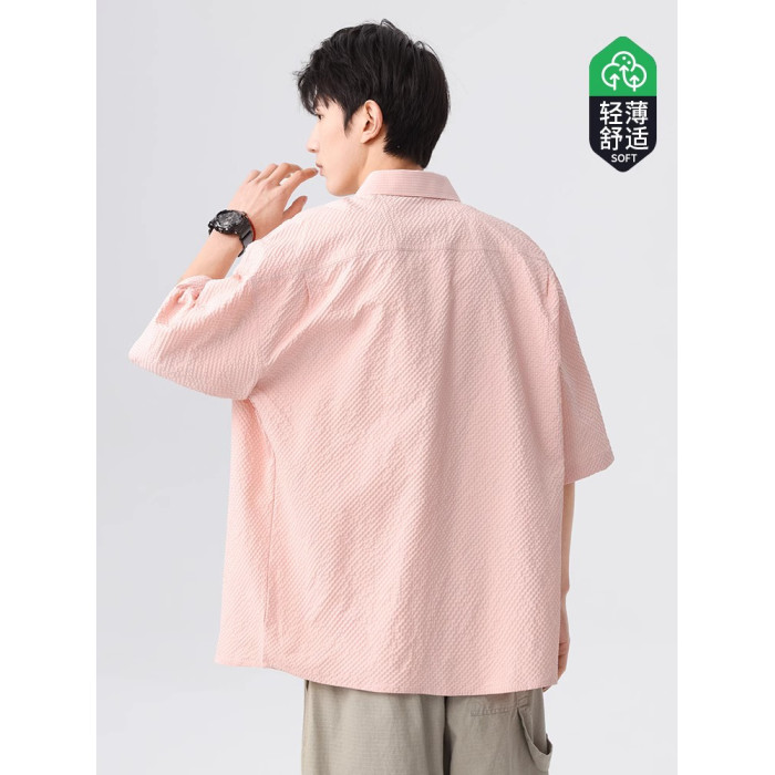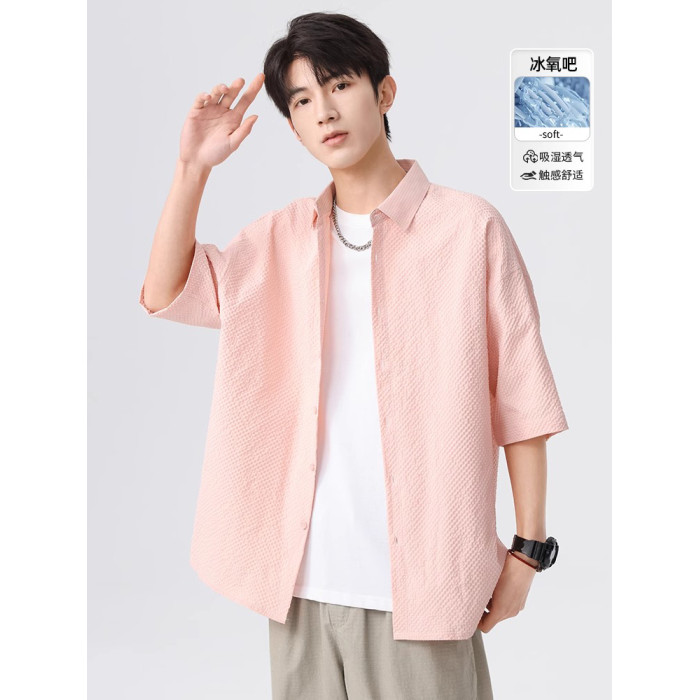 啄木鳥粉色外穿短袖襯衫男士夏季薄款冰絲2025新款寬松休閒襯衣K