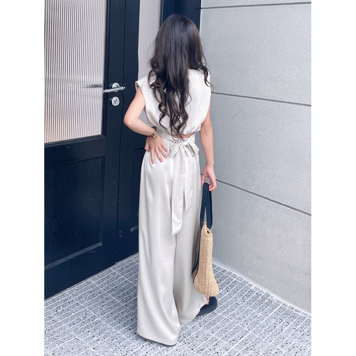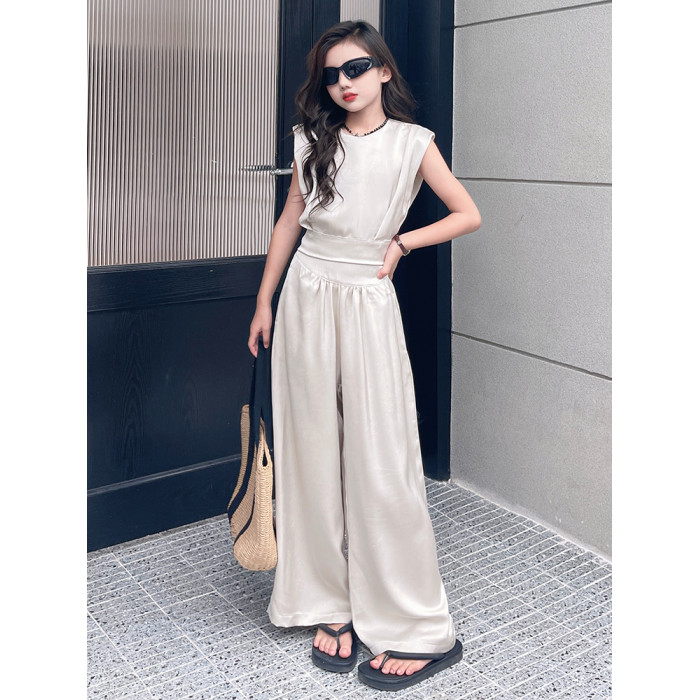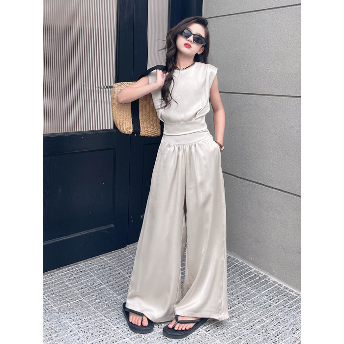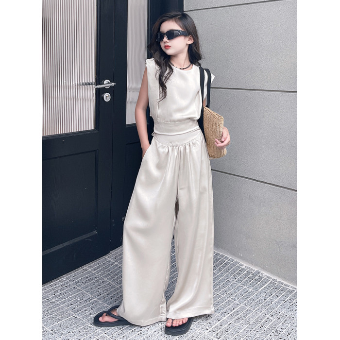 女童緞面夏季套裝2025新款洋氣時髦兒童無袖親子裝濶腿褲兩件套夏