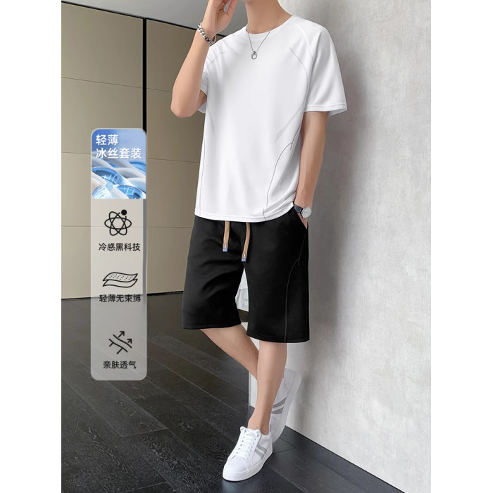 啄木鳥冰絲運動套裝男士夏季薄款休閒健身速乾短袖t恤短褲兩件套K