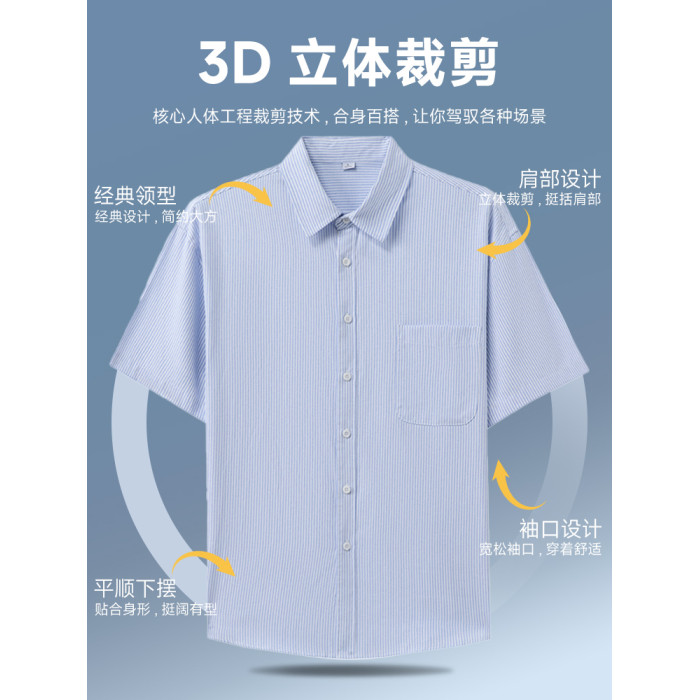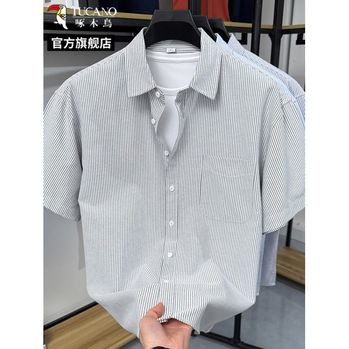 啄木鳥薄款襯衫男士短袖條紋襯衣2025夏季新款冰爽棉口袋款上衣C