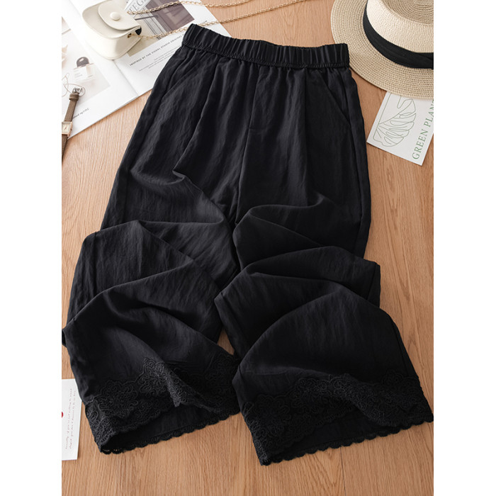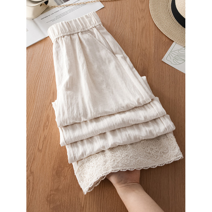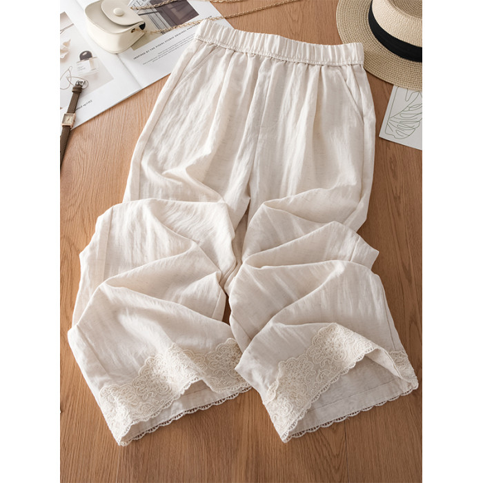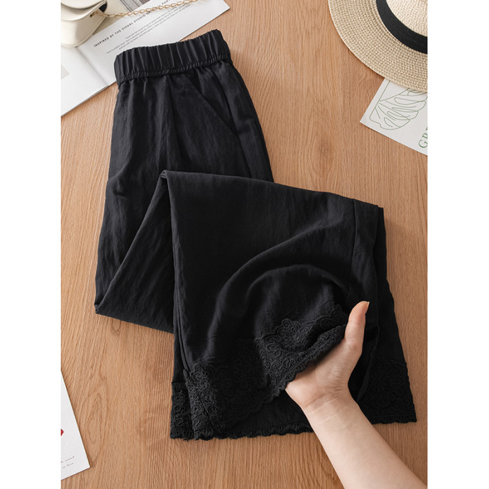 亞麻蕾絲拼接濶腿褲女2025夏季薄款高腰顯瘦寬松休閒簡約直筒褲子