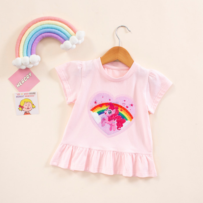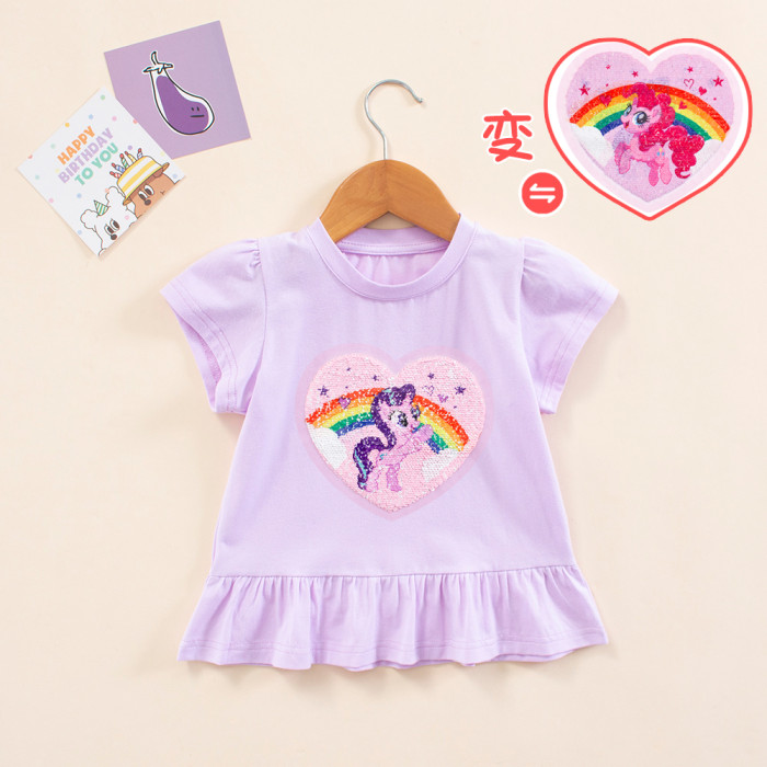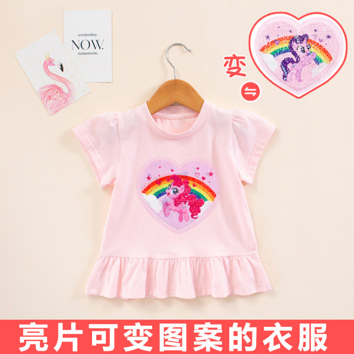 女童雙面翻轉閃片變色T恤兒童亮片可變圖案衣服彩虹馬2025新款