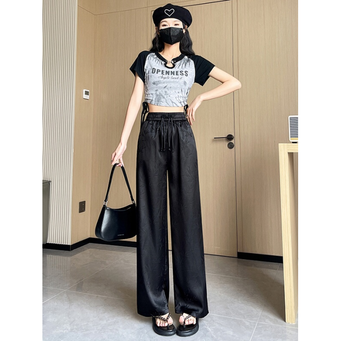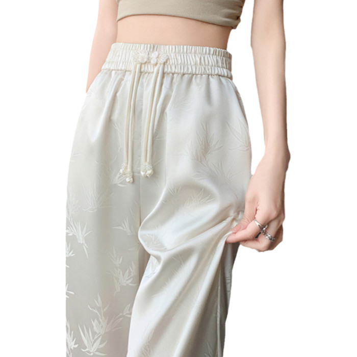 mjae新中式國風緞面提花白色濶腿褲女夏季高腰直筒褲小個子醋酸褲
