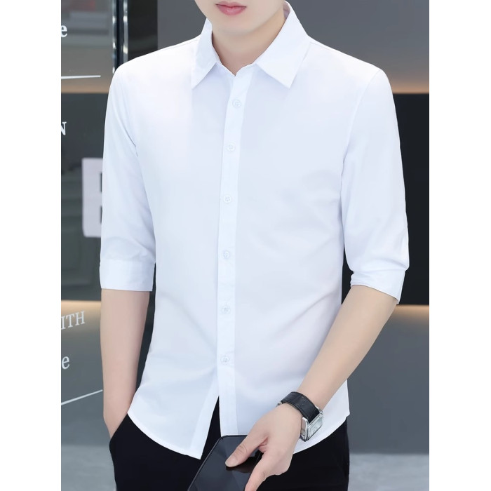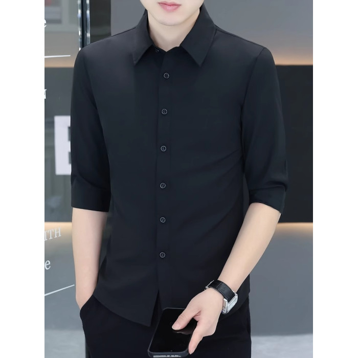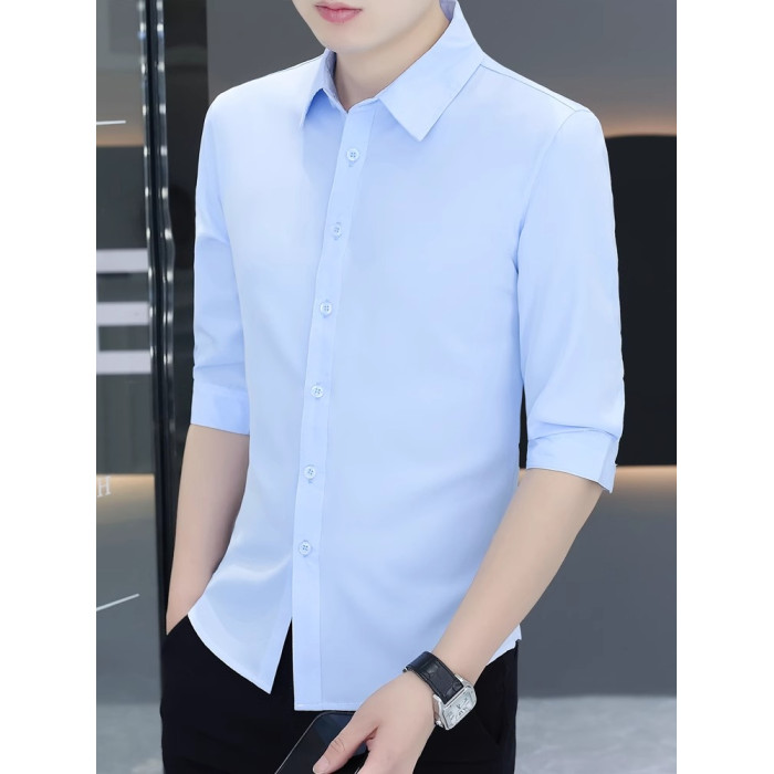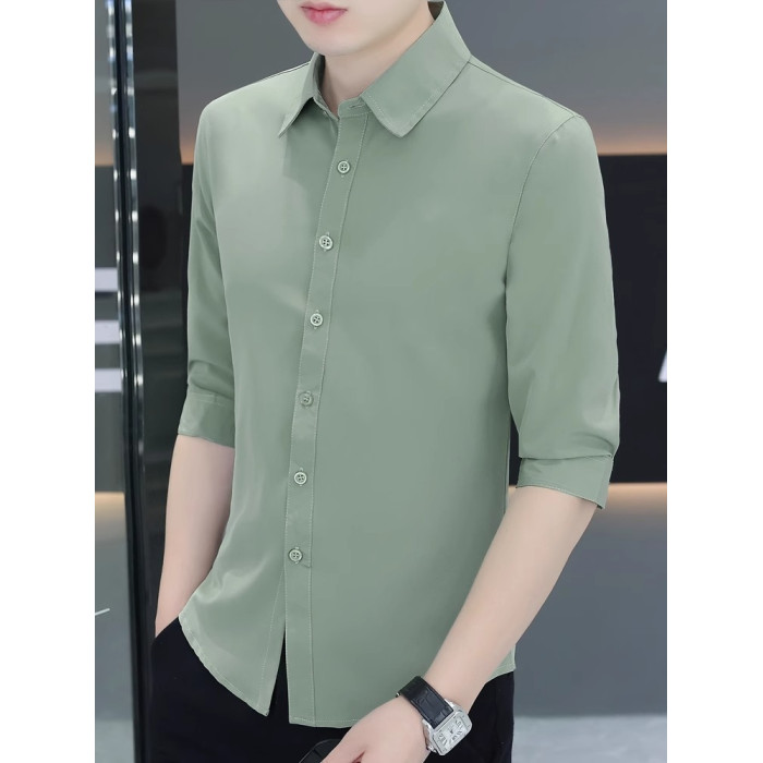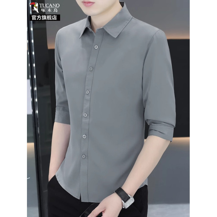 啄木鳥七分袖襯衫男夏季薄款冰絲免燙襯衣潮流休閒修身速乾上衣K