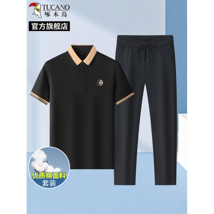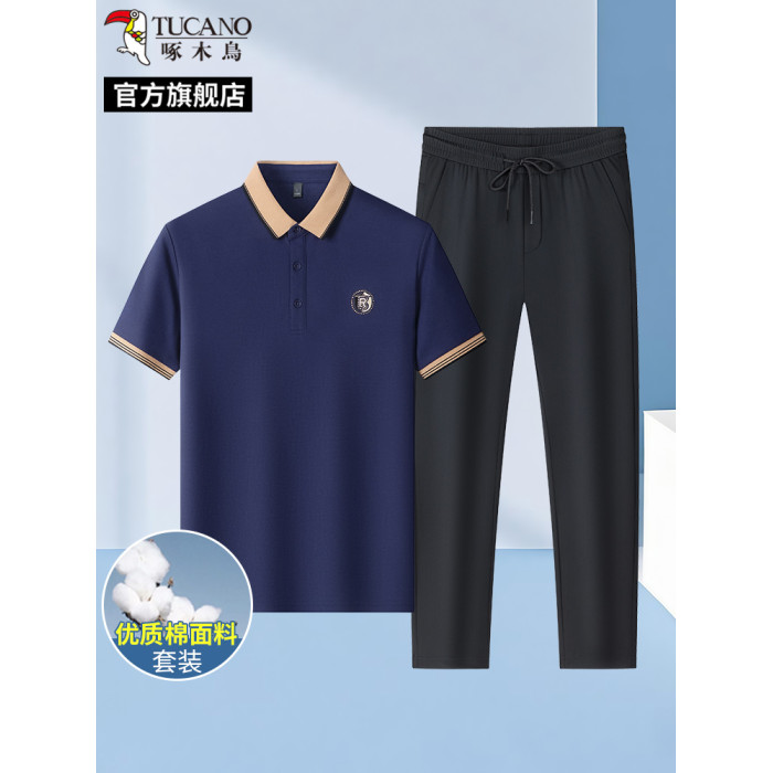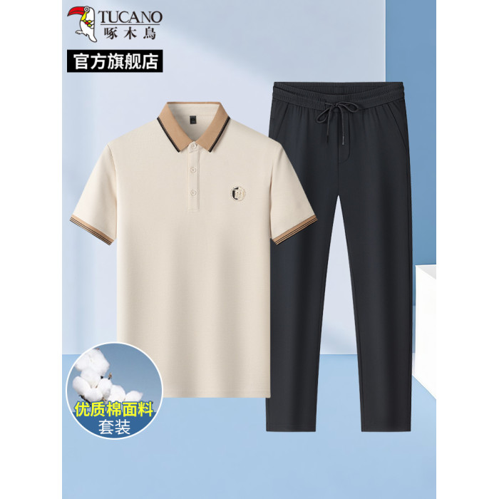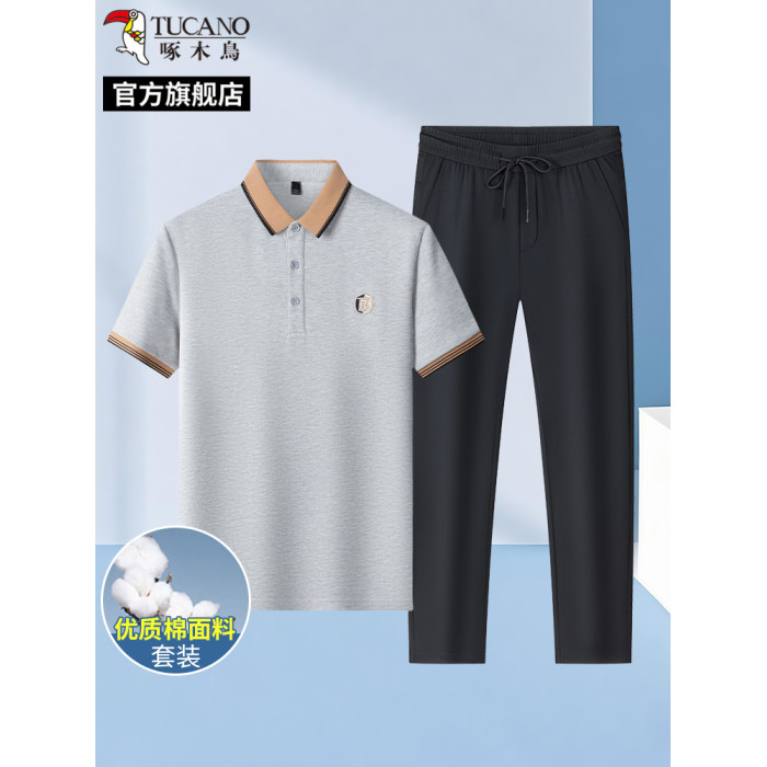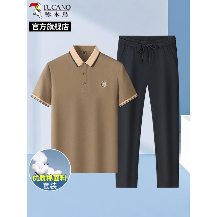 啄木鳥2025夏季短袖POLO衫+冰絲直筒休閒長褲子爸爸男士T恤套裝H