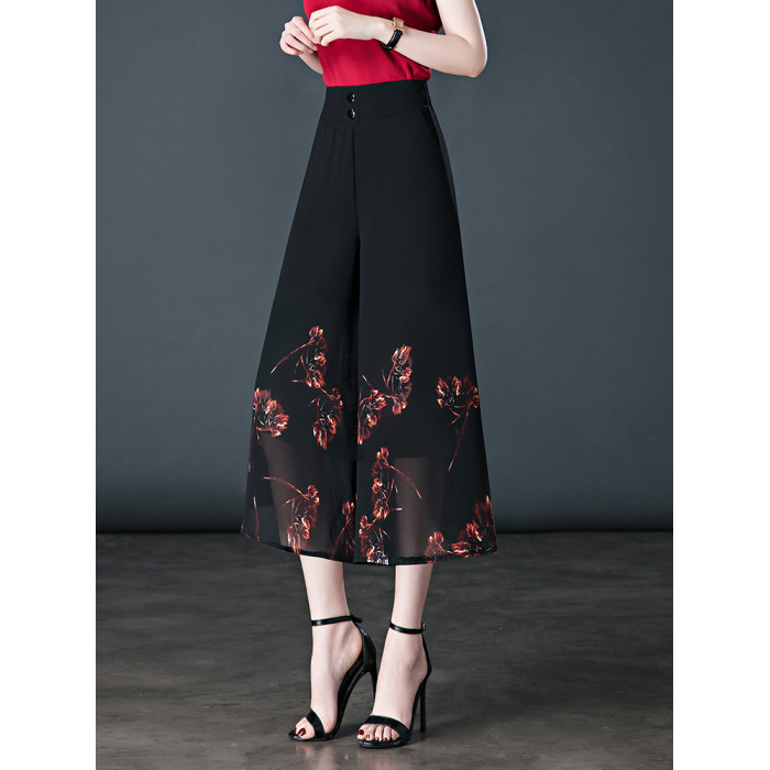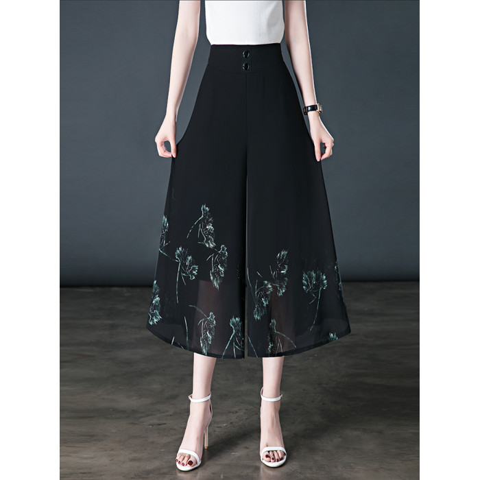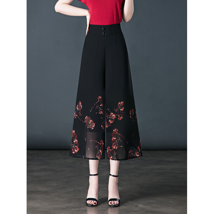 雪紡濶腿褲女2025夏季薄款中年媽媽花褲子松緊腰顯瘦冰絲八分裙褲