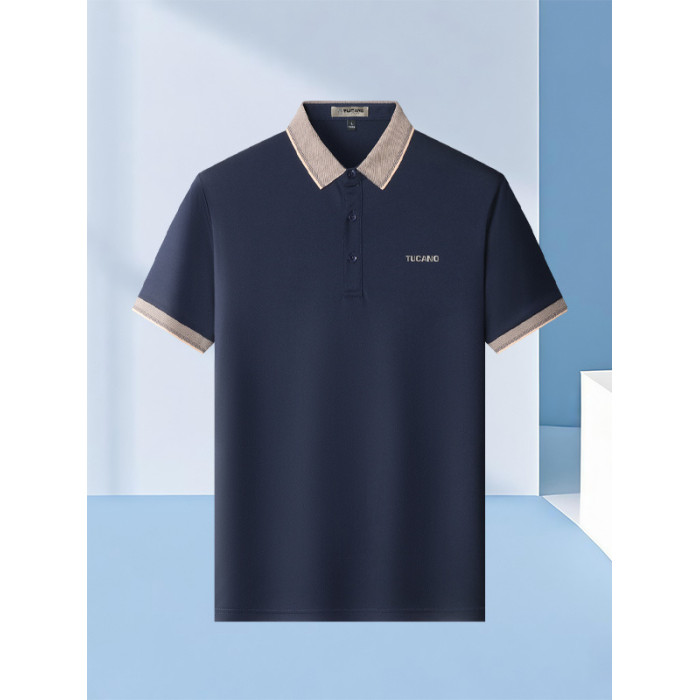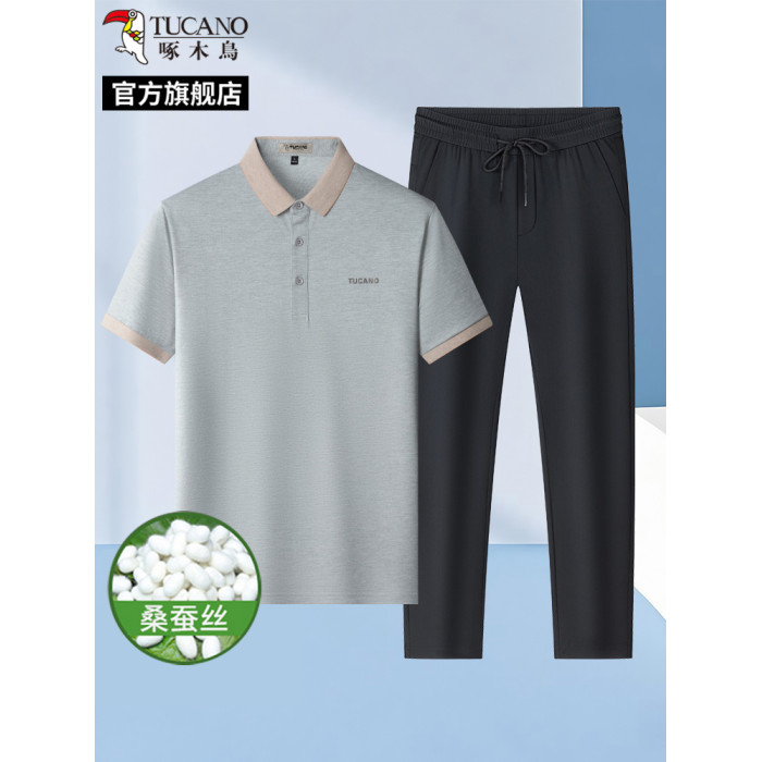 啄木鳥夏季桑蠶絲短袖POLO衫+冰絲直筒休閒褲子中年男士T恤套裝H