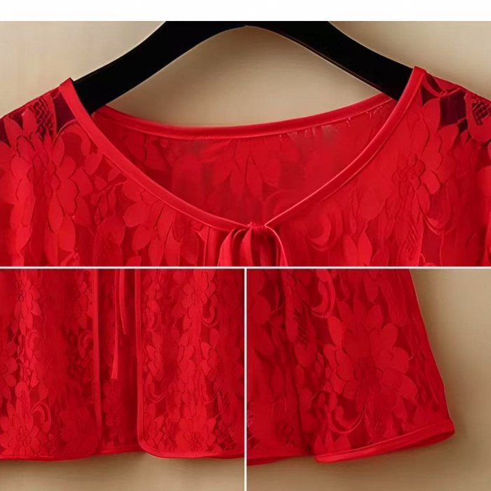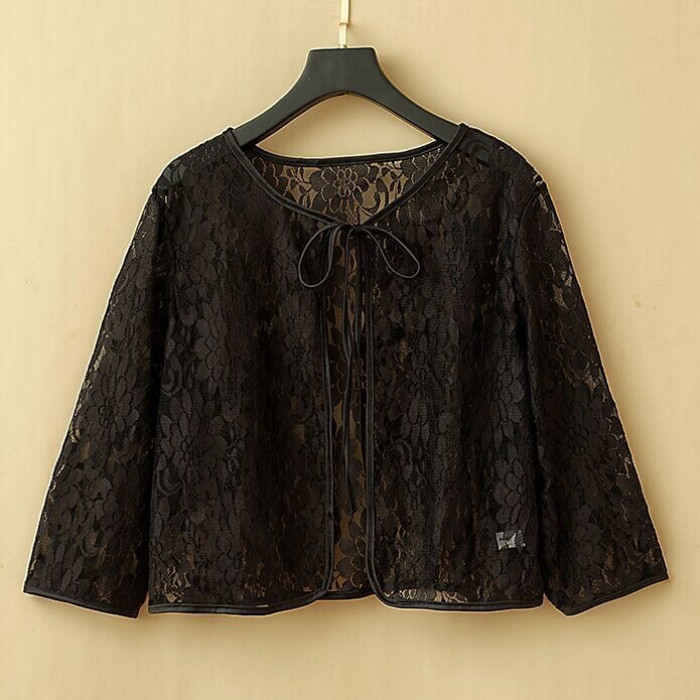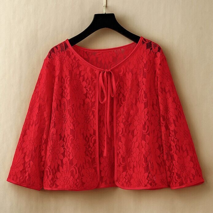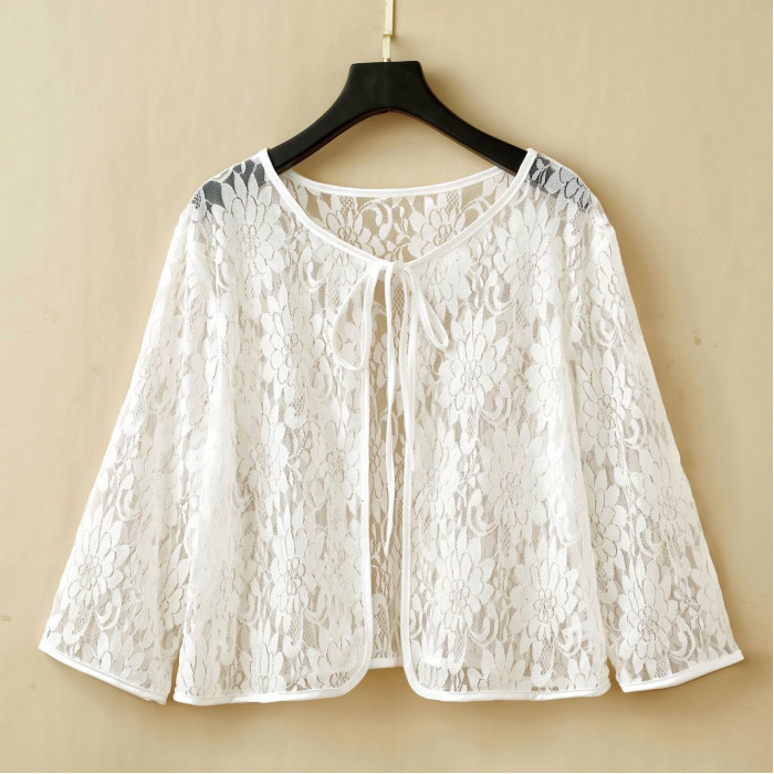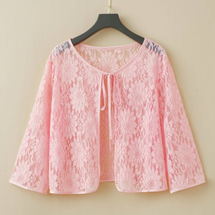 高檔蕾絲外搭秋春秋夏季新款披肩配裙子系帶開衫粉紅色百搭防曬衣