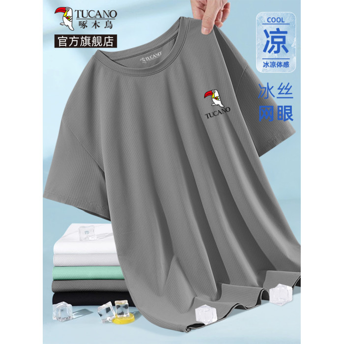 啄木鳥冰絲t恤短袖男款夏季灰色健身運動體恤衫胖子大碼半袖上衣Y