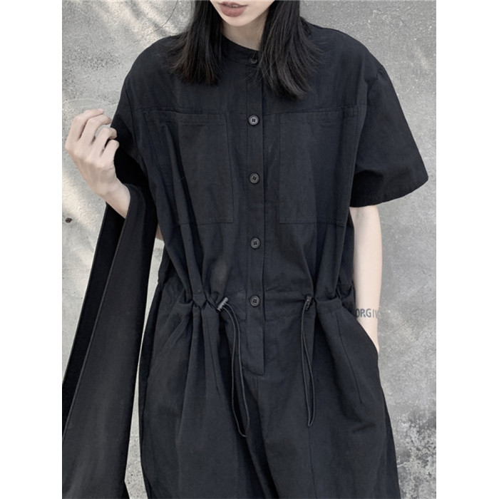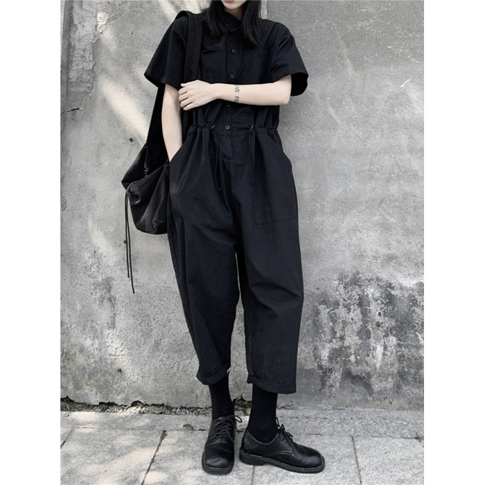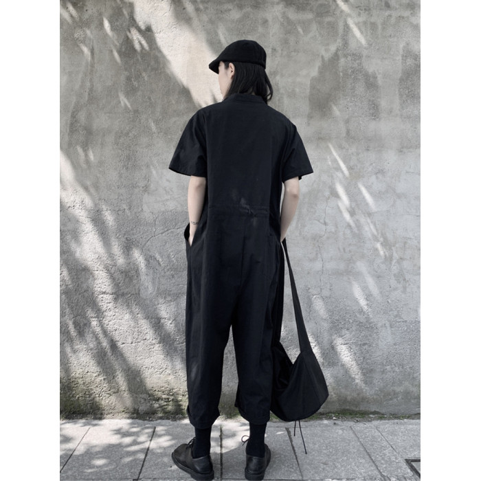 山本風暗黑小衆設計感短袖連體衣女夏季寬松顯瘦濶腿情侶連體褲潮