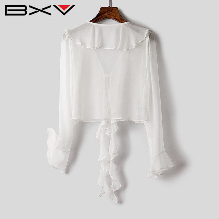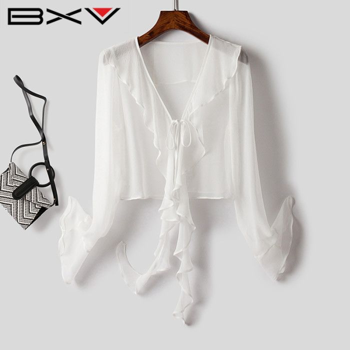 BXV喇叭袖真絲防曬衣女短款2025夏新款桑蠶絲荷葉邊開衫飄逸披肩