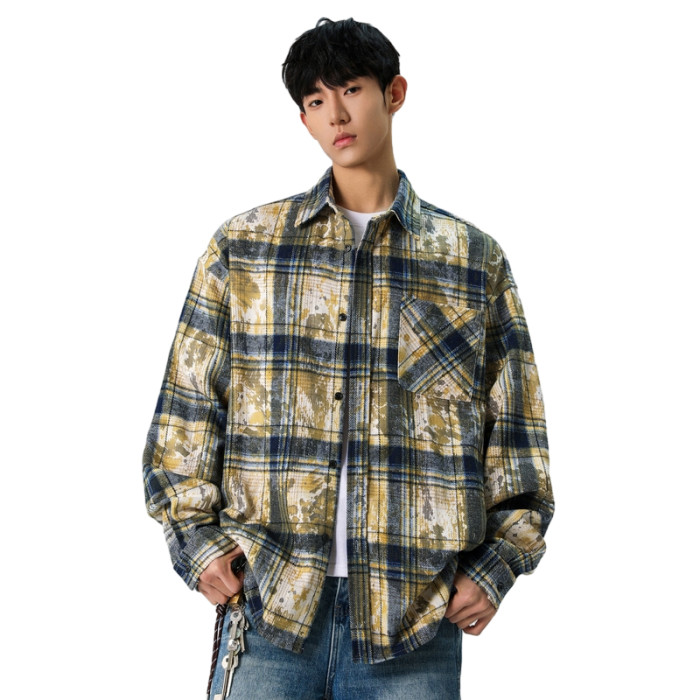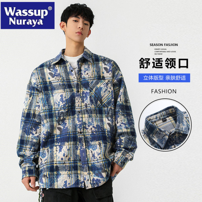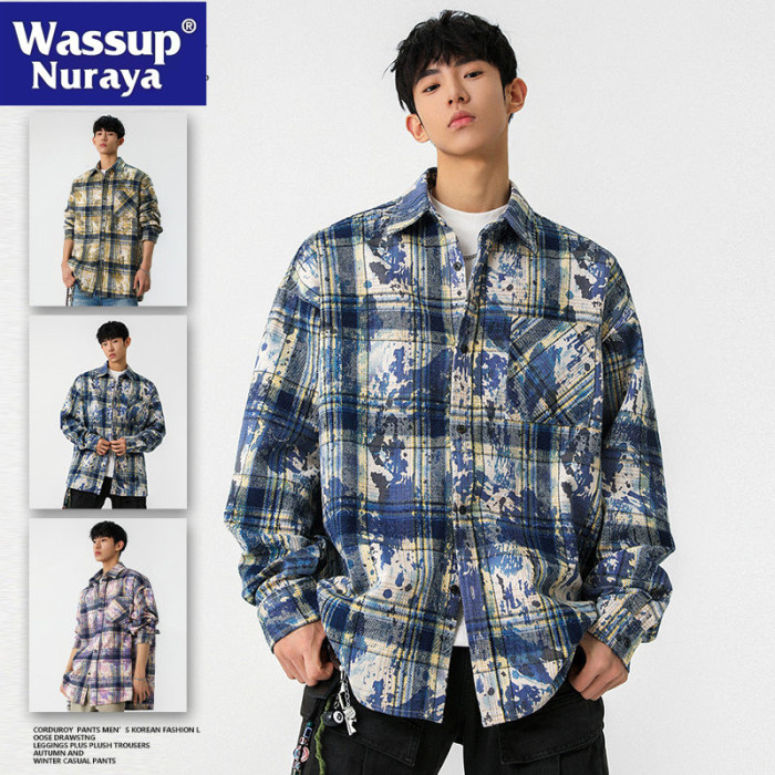 WASSUP NURAYA紥染格子翻領襯衫男長袖春秋格紋襯衣百搭休閒外套