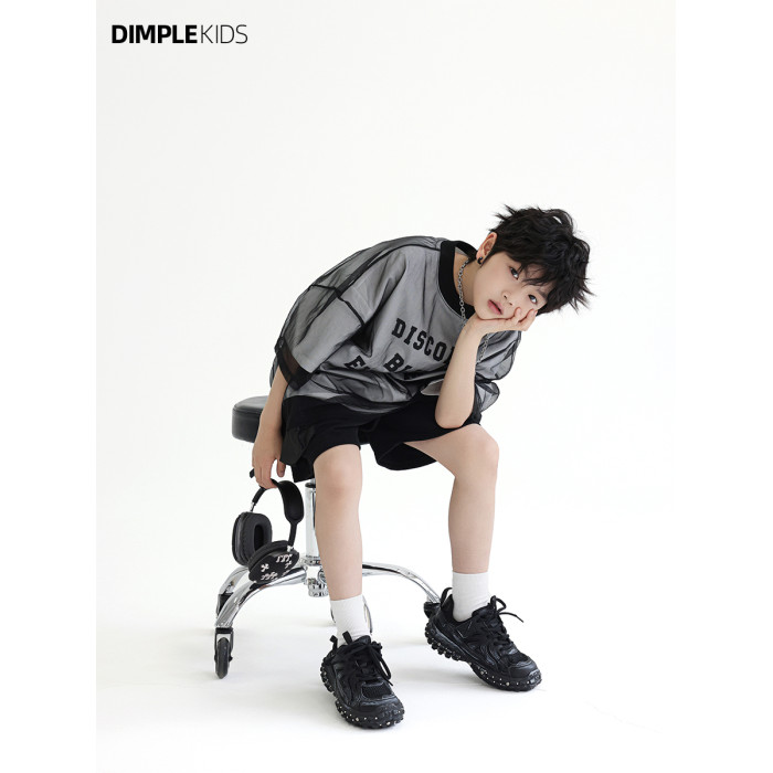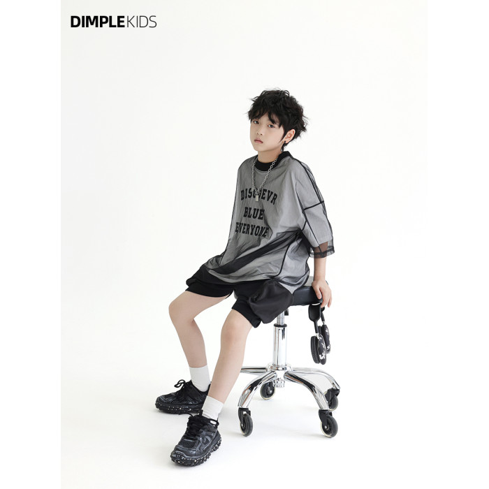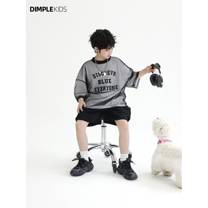 高甜梨渦童裝「時髦曡滿」男童t恤短袖女童夏兒童假兩件網紗上衣