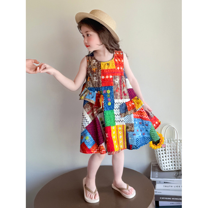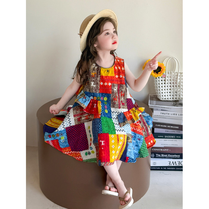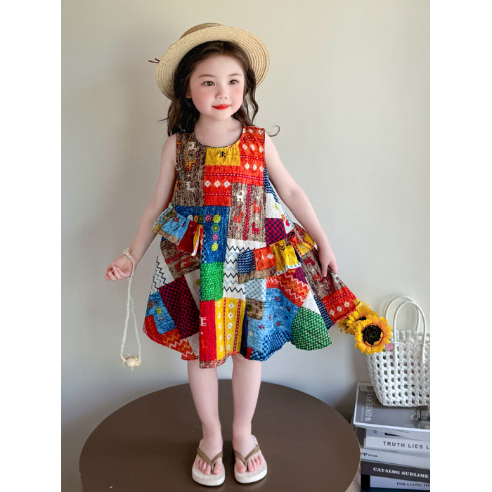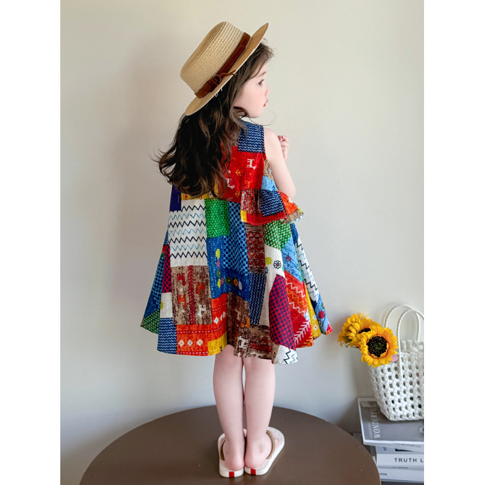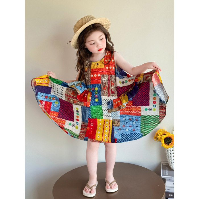 女童彩色格子拼接背心裙波西米亞兒童連衣裙三亞度假海邊沙灘裙子