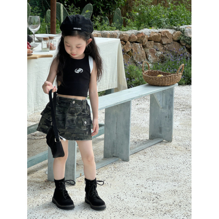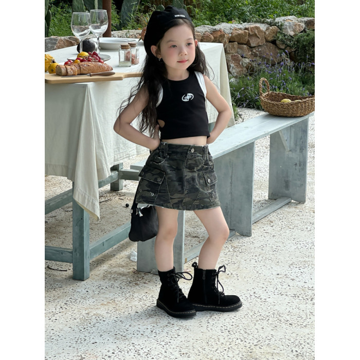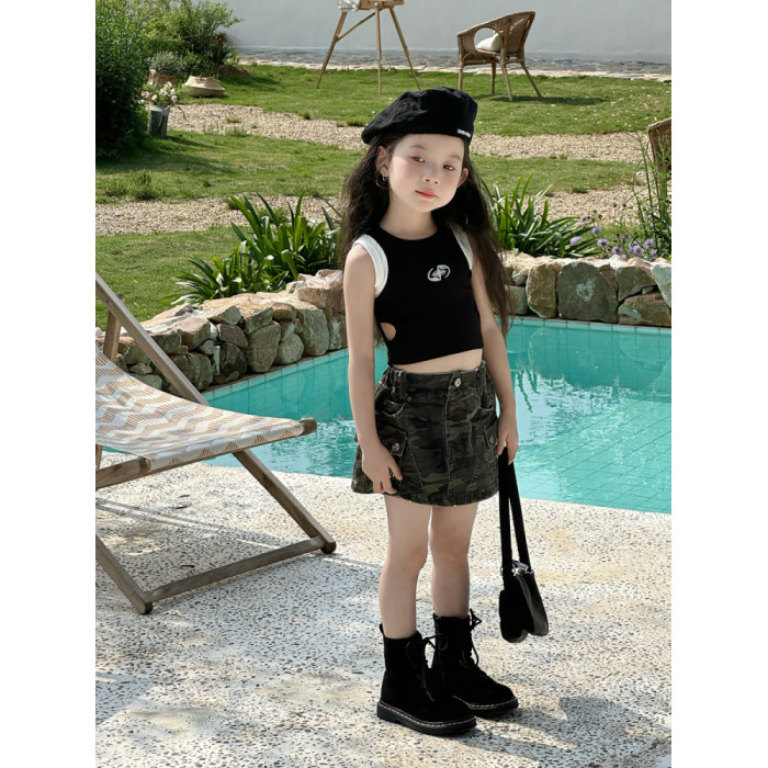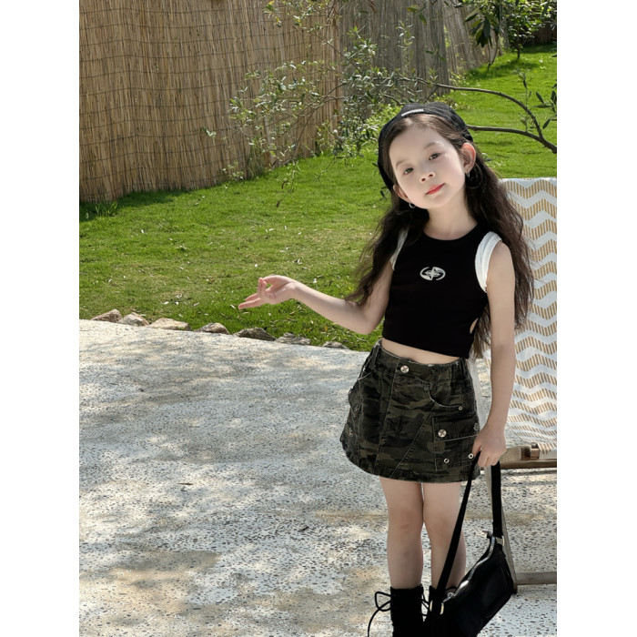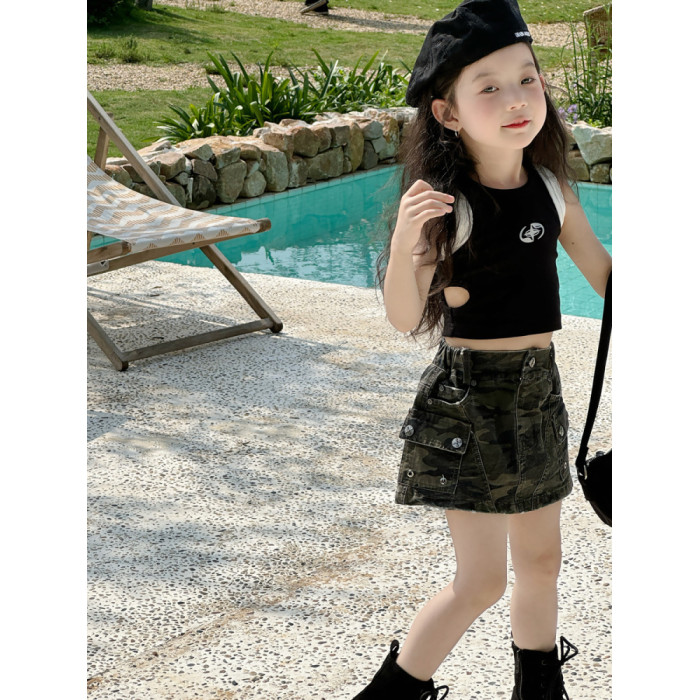 女童夏季露腰無袖短背心修身小衆工字上衣+迷彩牛仔工裝短裙A字裙