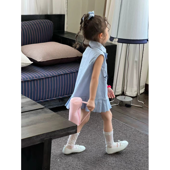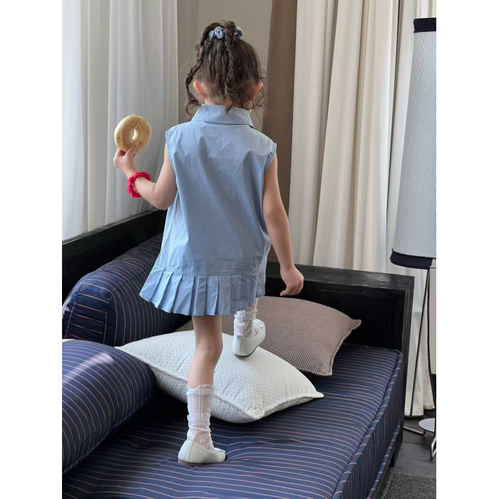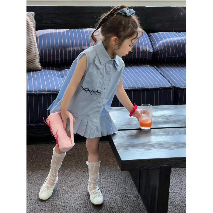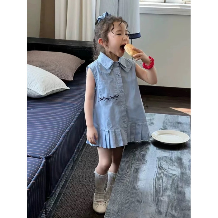 女童夏季連衣裙2025新款韓版童裝學院風襯衫領單排釦百褶背心裙子