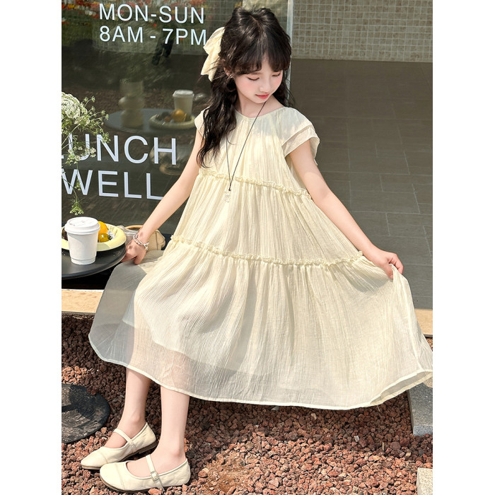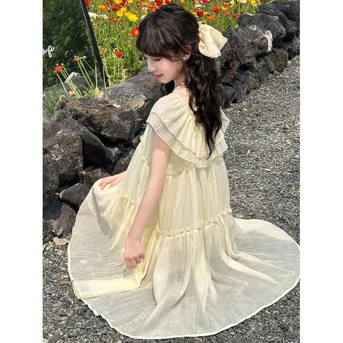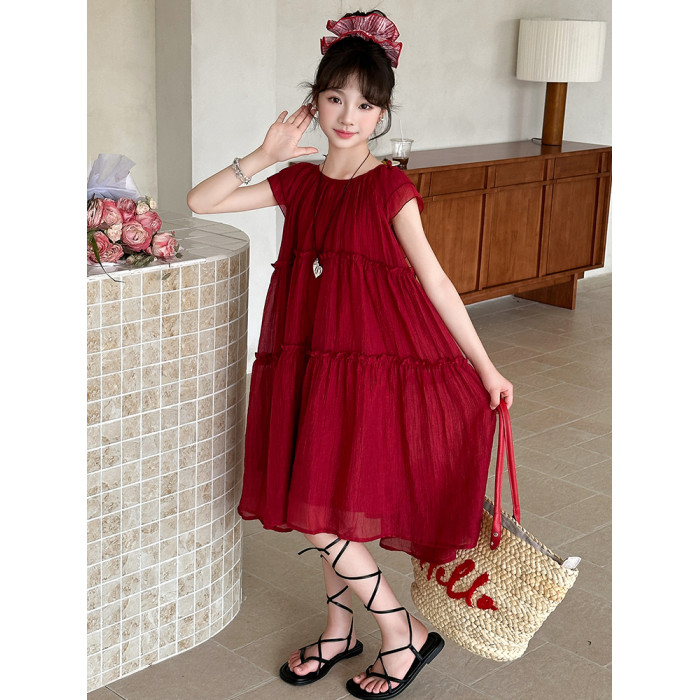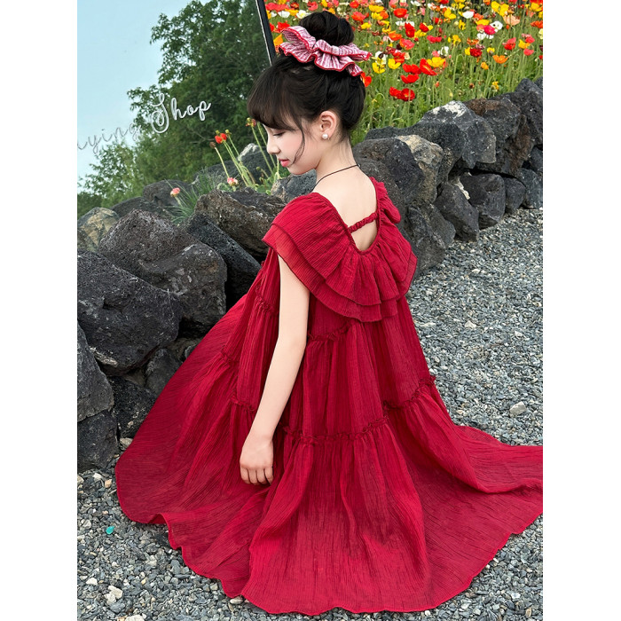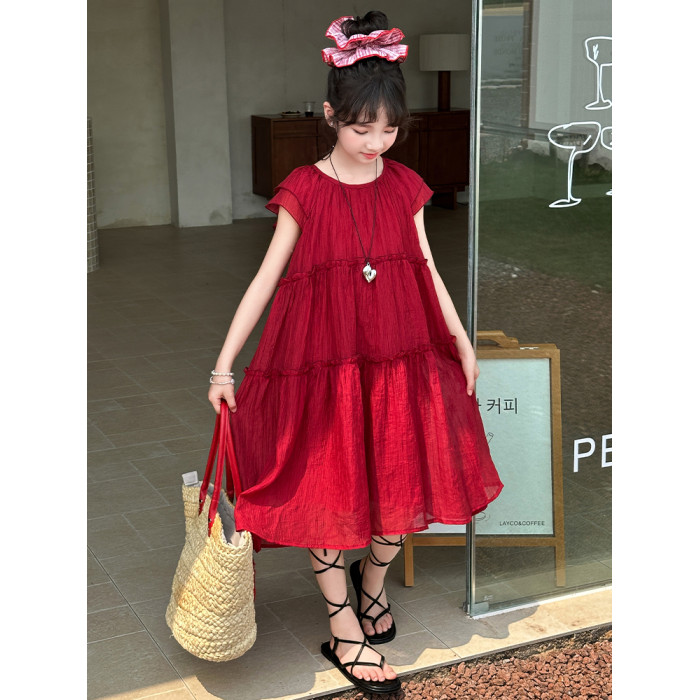 女童連衣裙2025新款中大童度假風夏季後背鏤空中大童紅色沙灘裙子