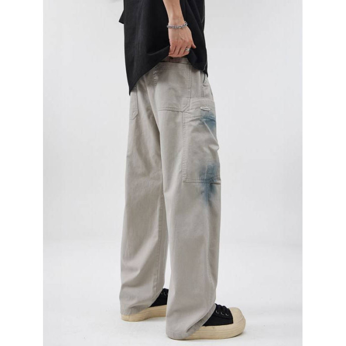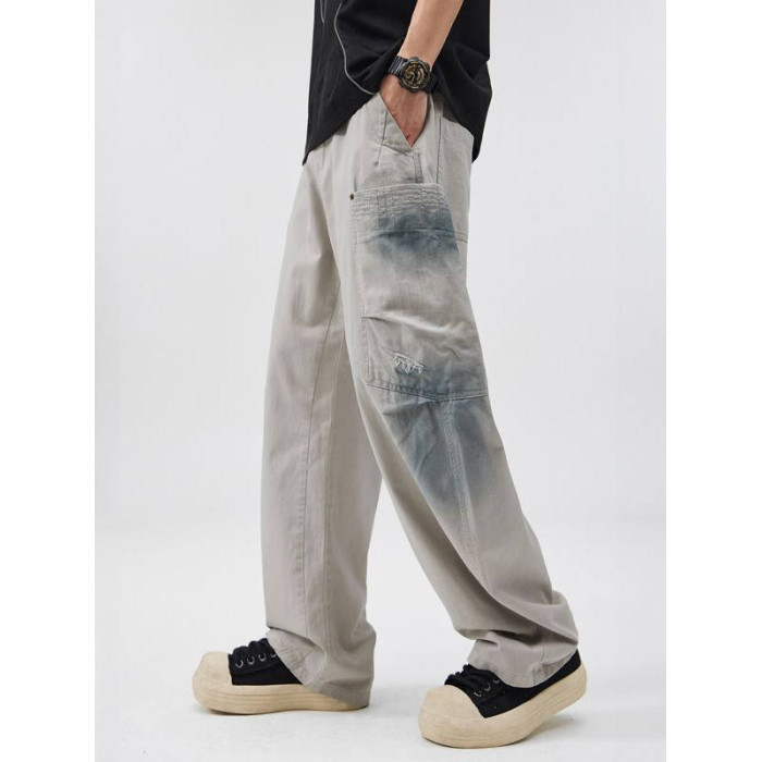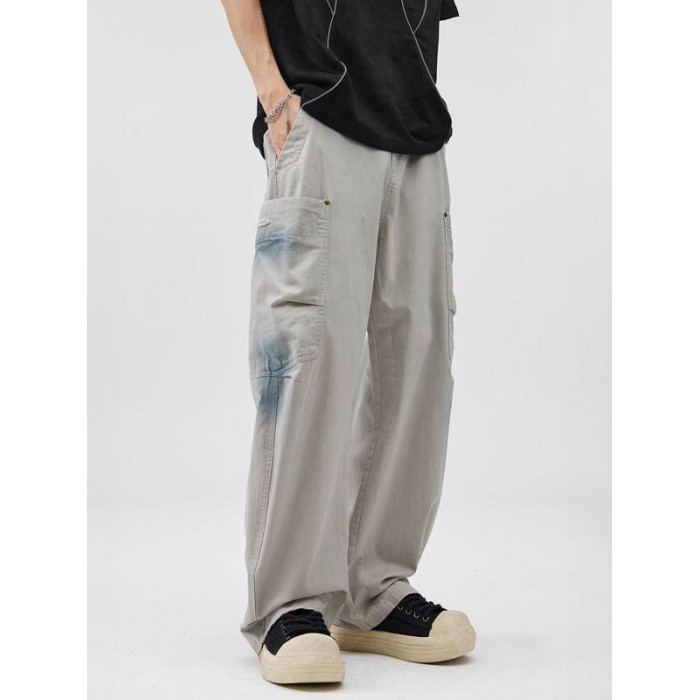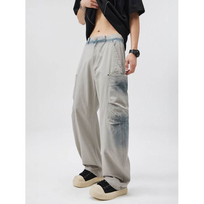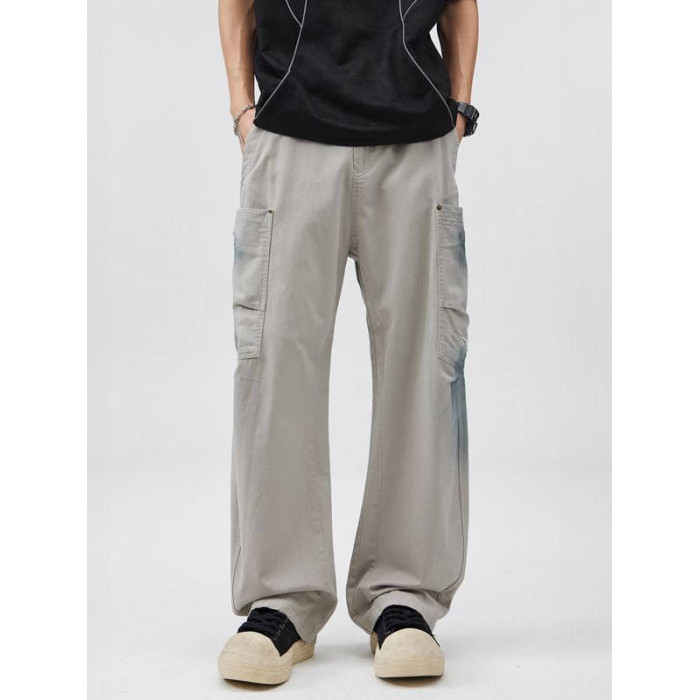2025美式復古純棉紥染多口袋工裝褲百搭寬松直筒垂感濶腿彎刀褲潮