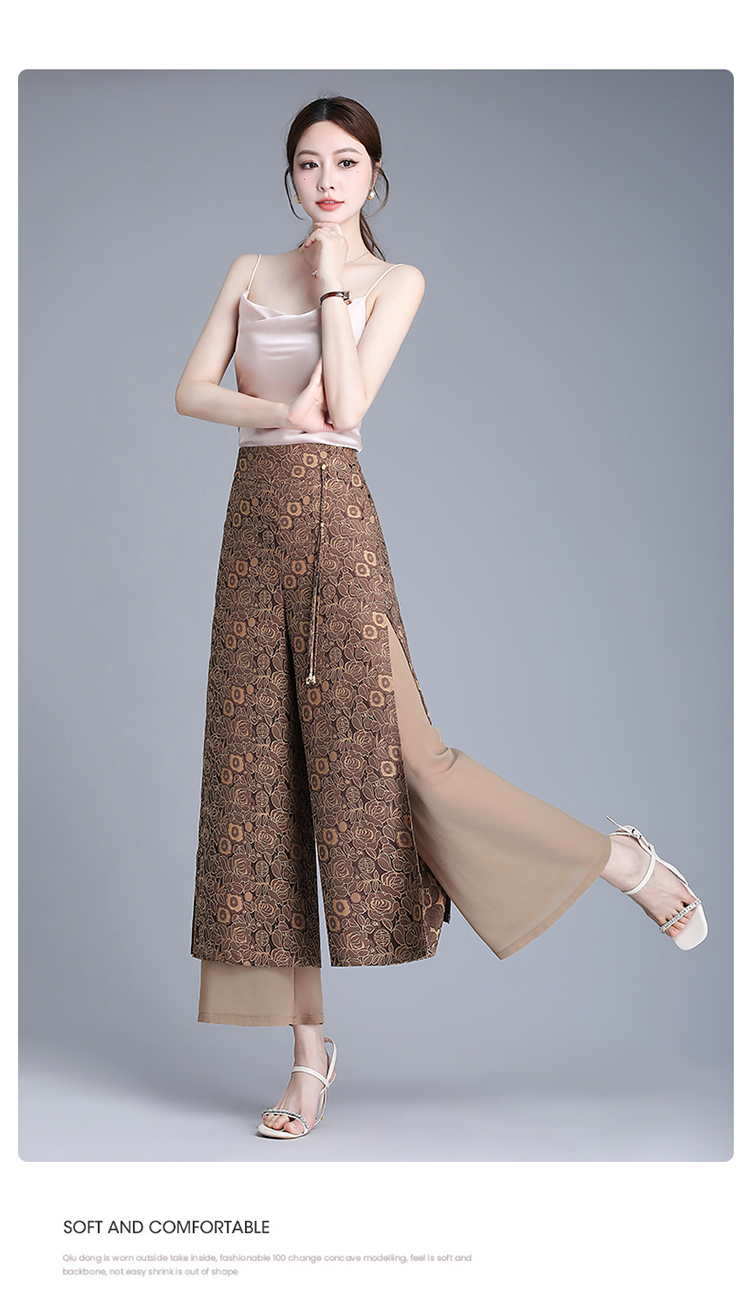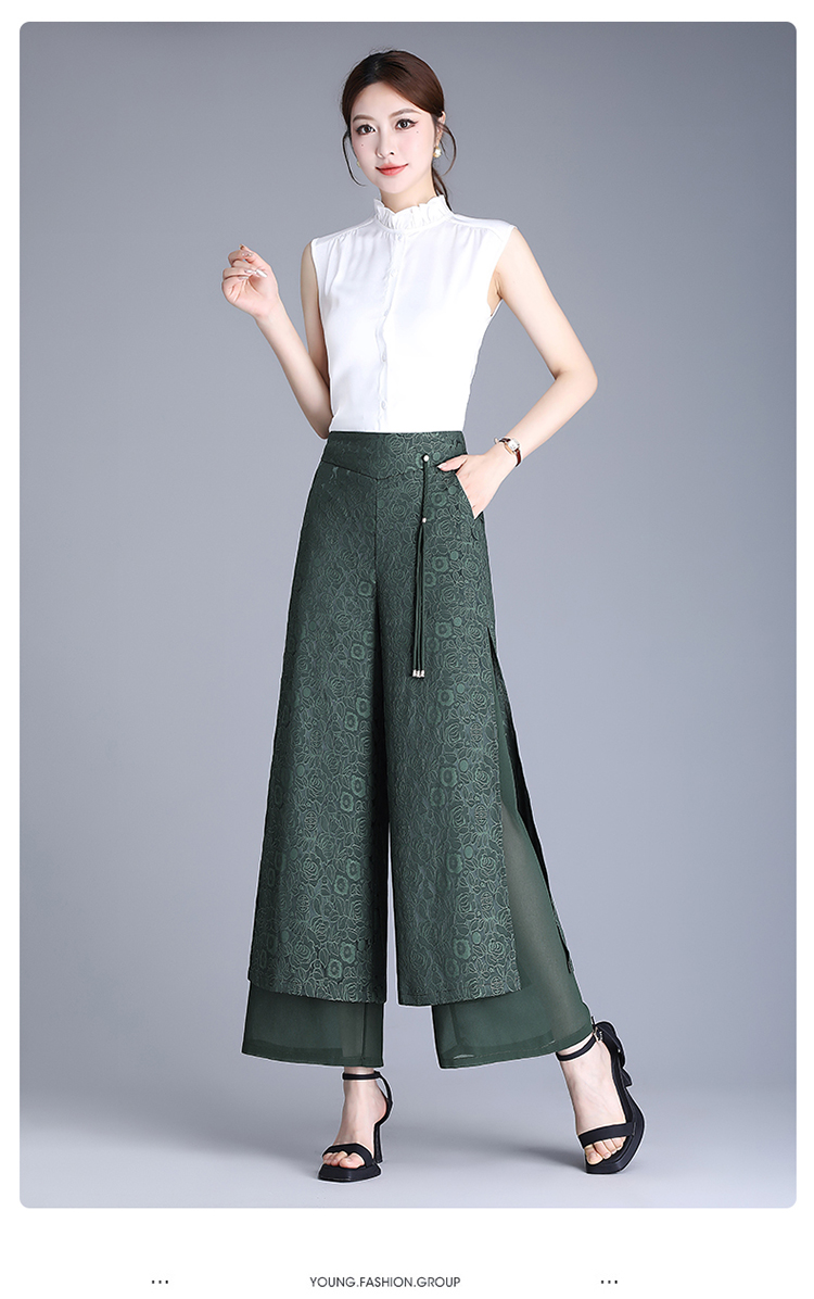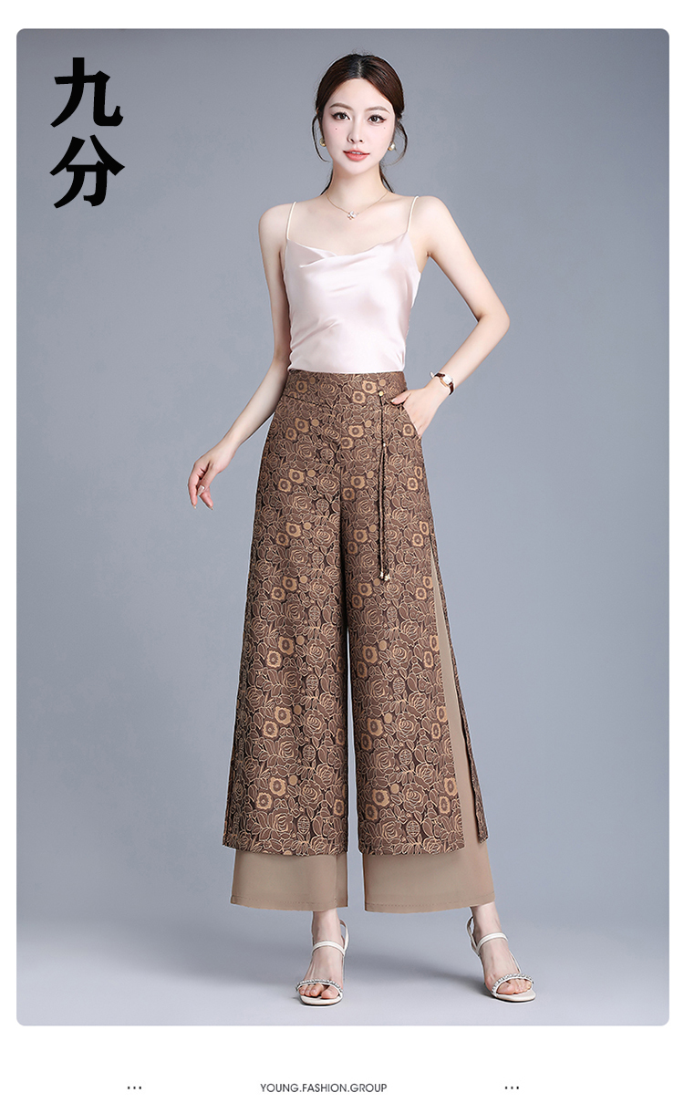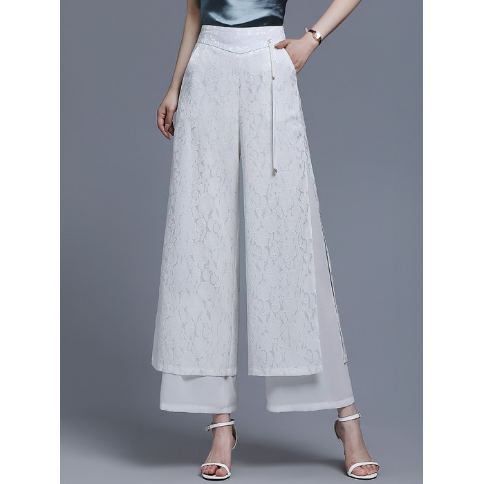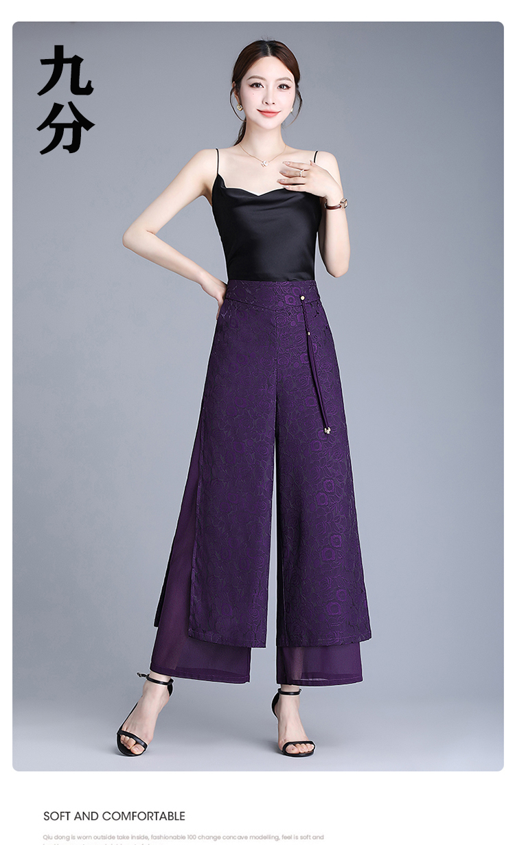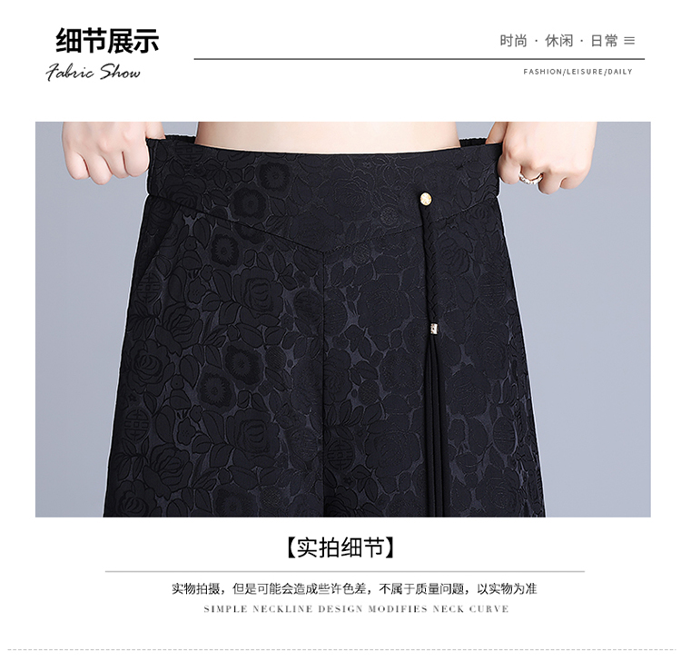 國風開叉褲子女夏季薄款高腰寬松直筒顯瘦垂感中式提花冰絲濶腿褲