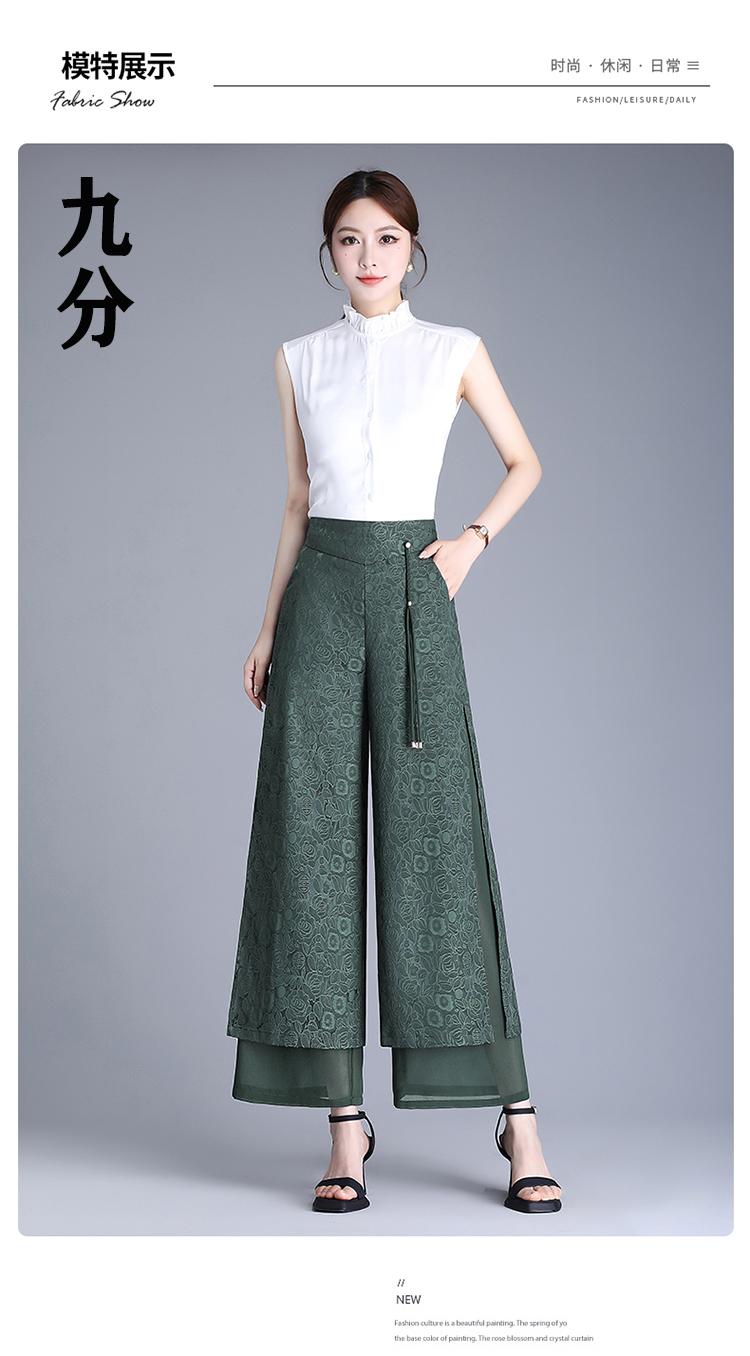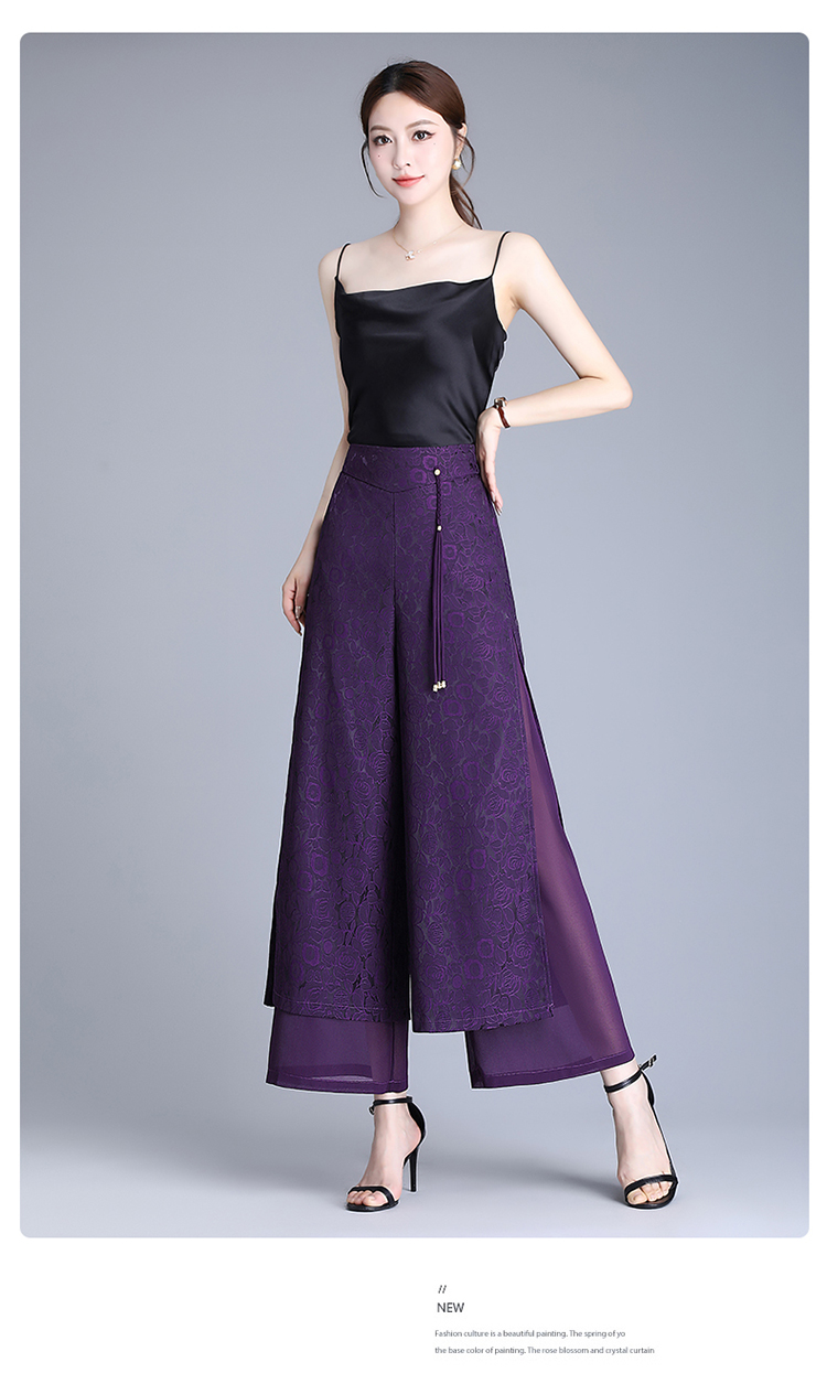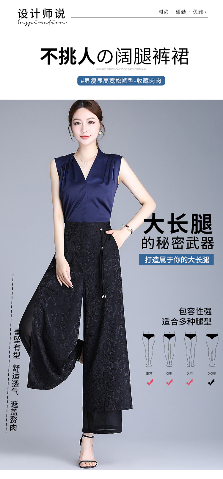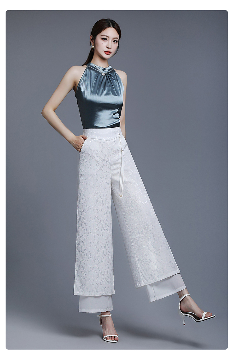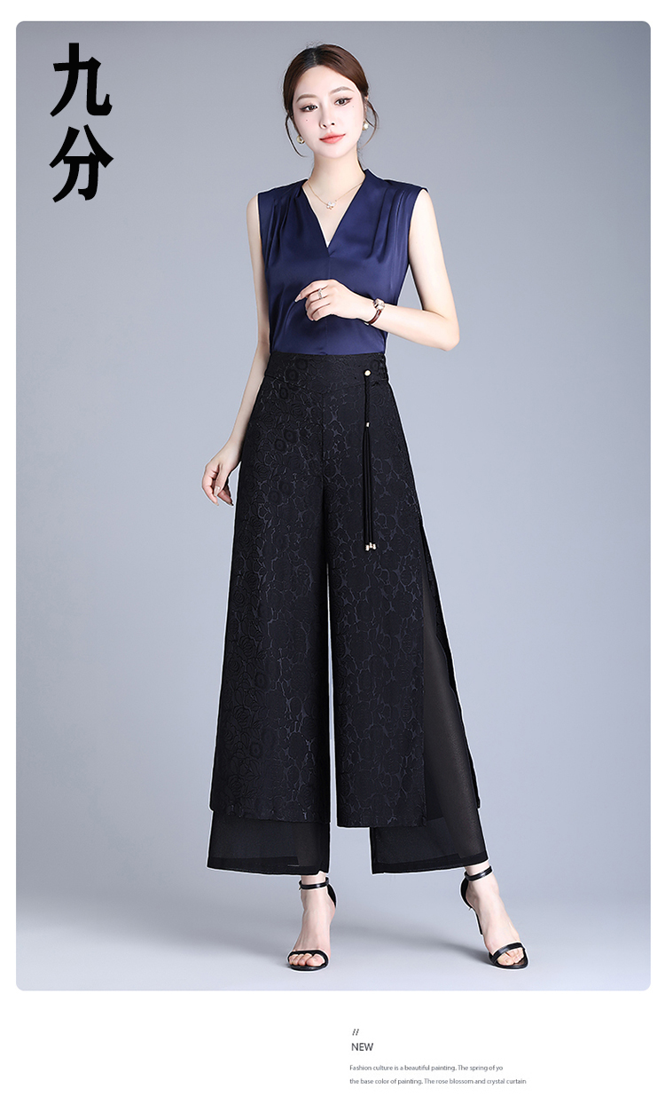 國風開叉褲子女夏季薄款高腰寬松直筒顯瘦垂感中式提花冰絲濶腿褲