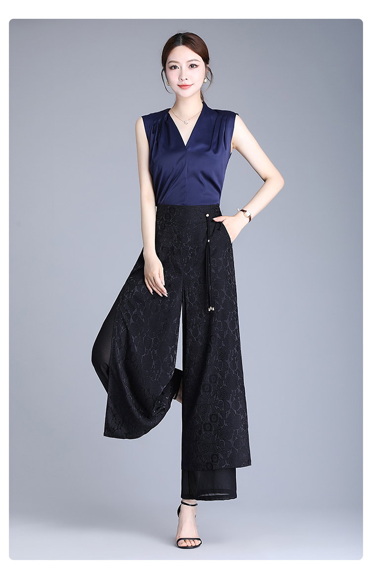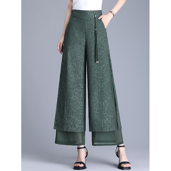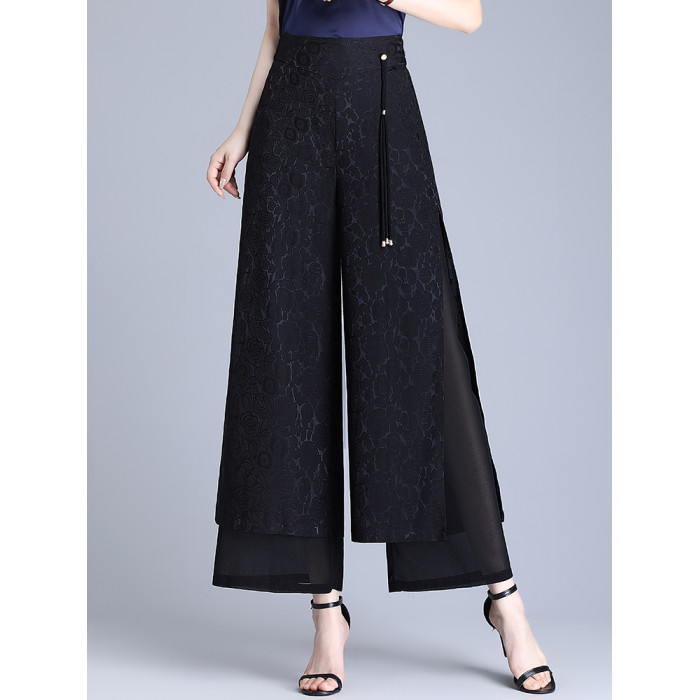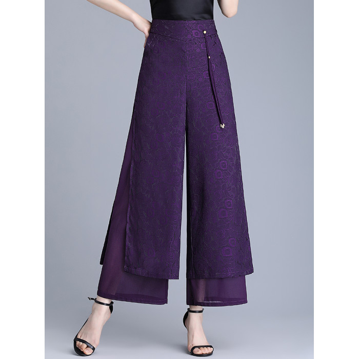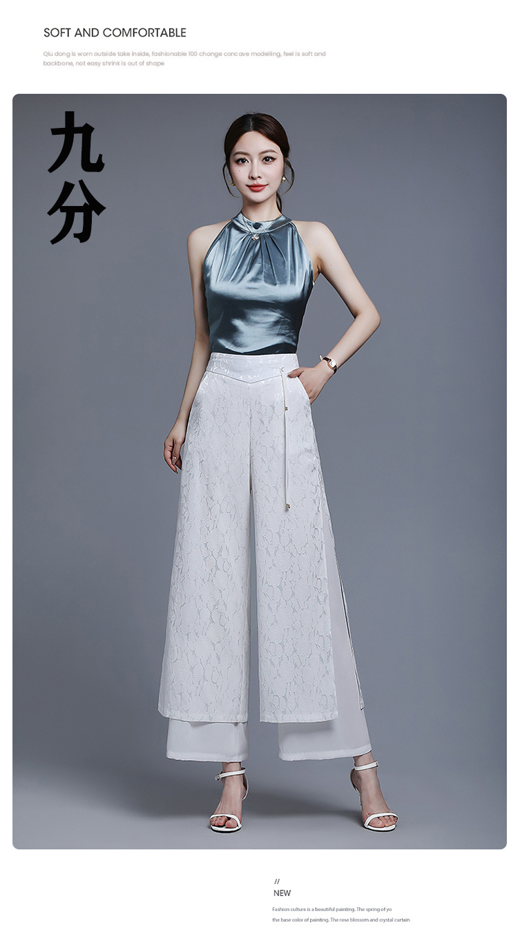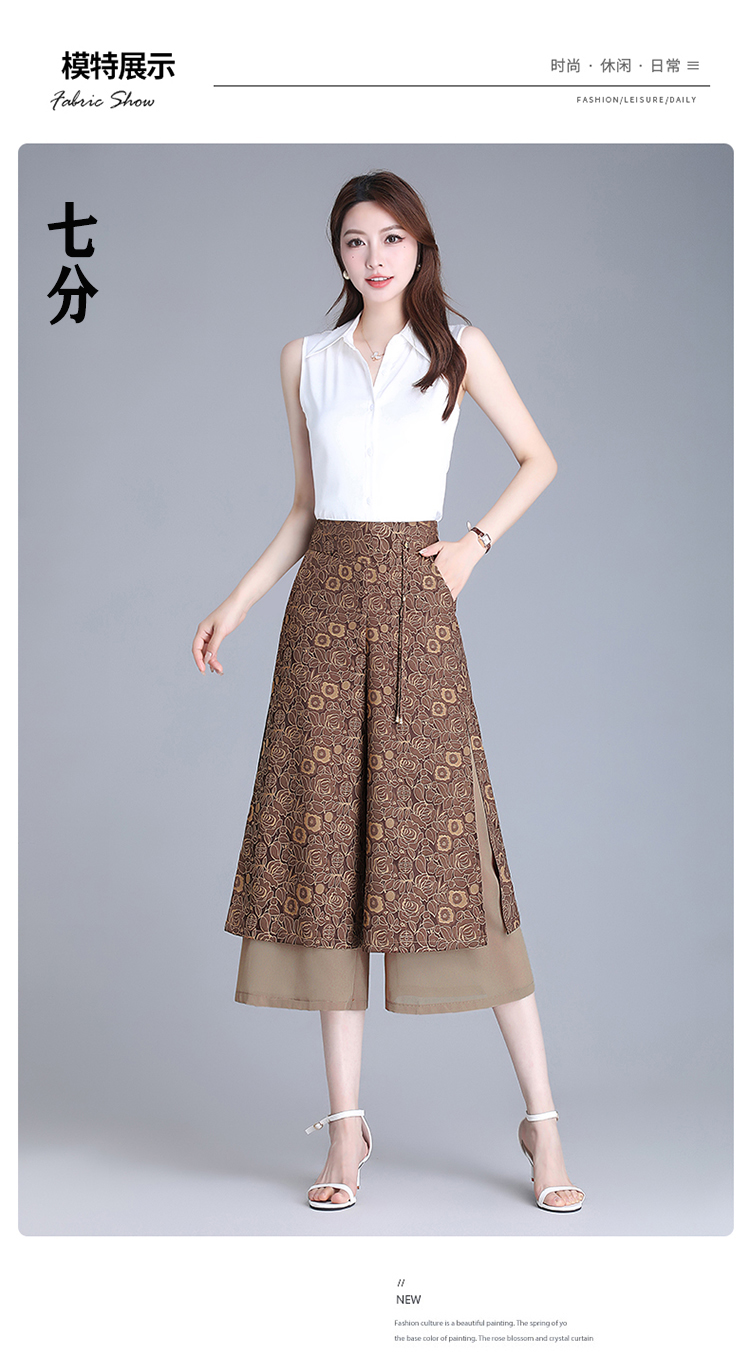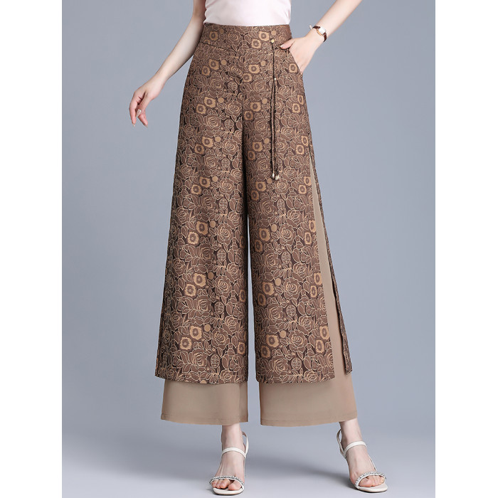 國風開叉褲子女夏季薄款高腰寬松直筒顯瘦垂感中式提花冰絲濶腿褲