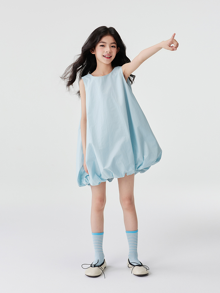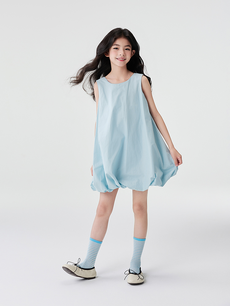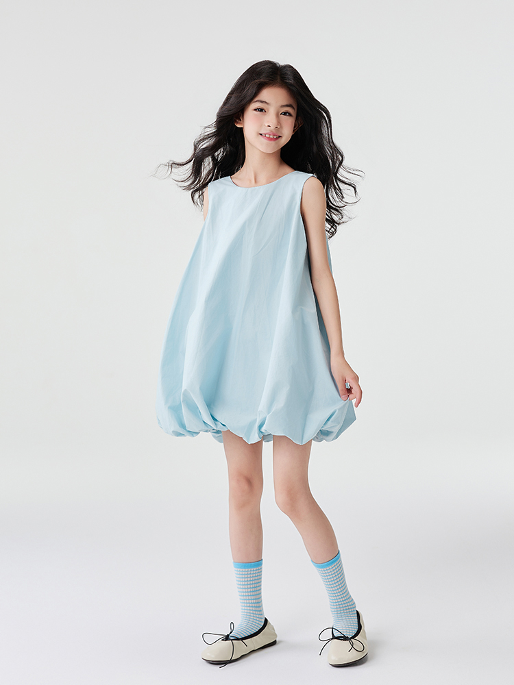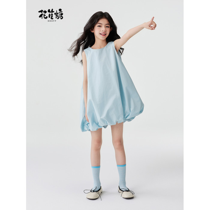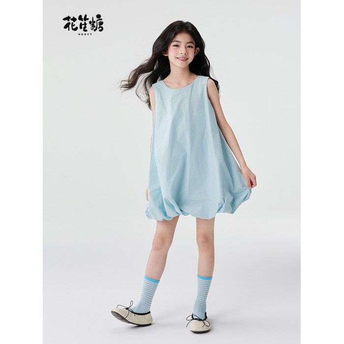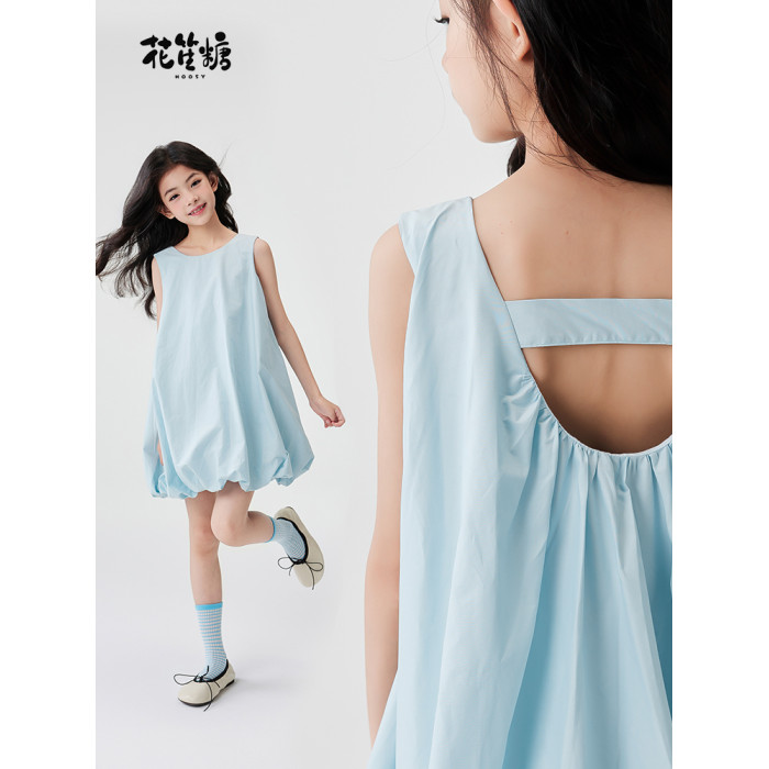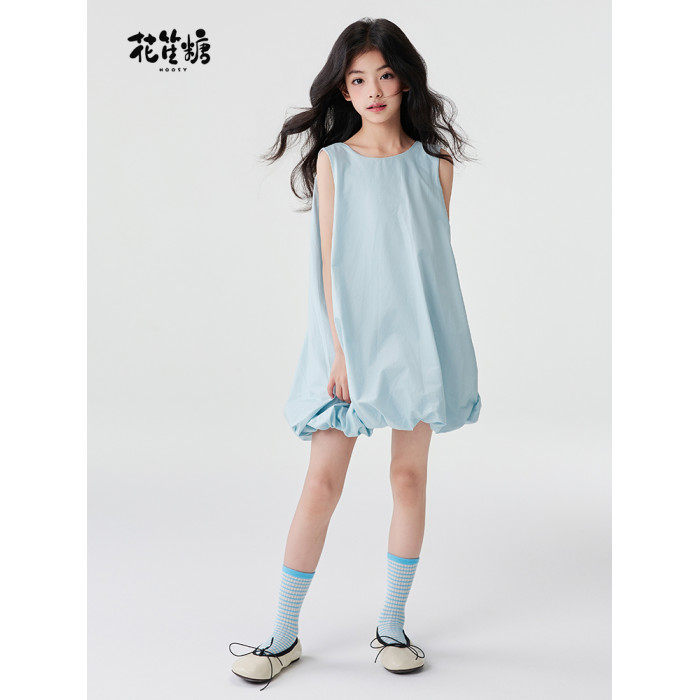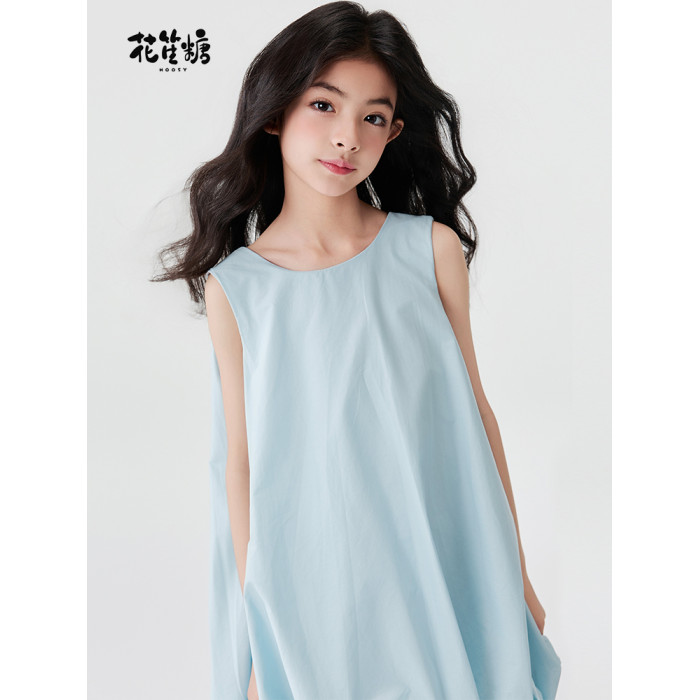 花笙糖女童無袖連衣裙中大童夏季新款純色背心裙女孩可愛花苞裙