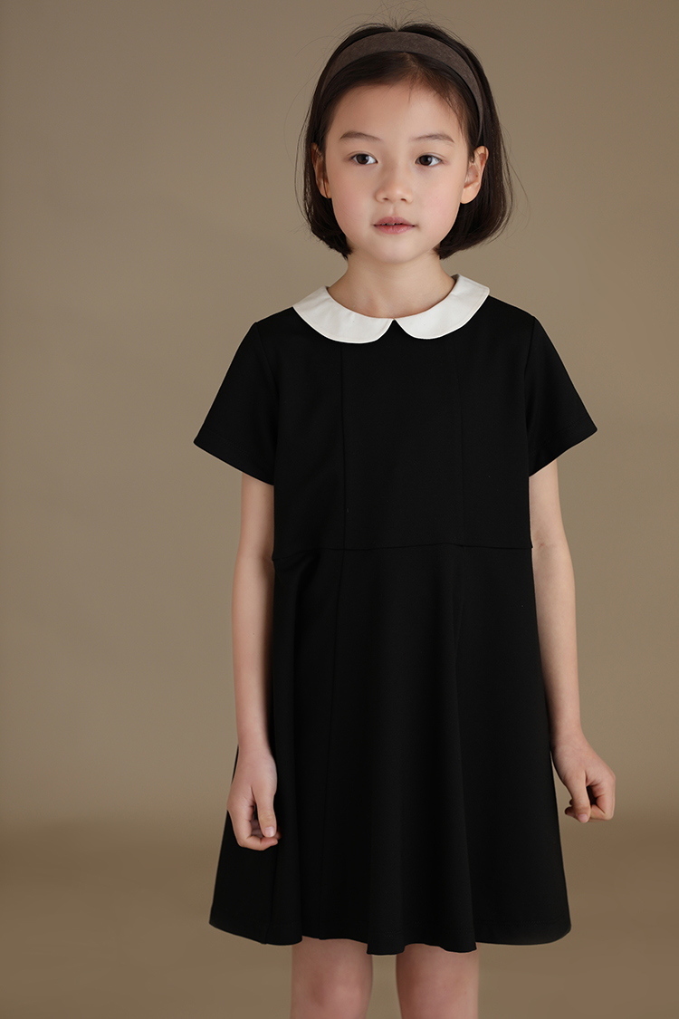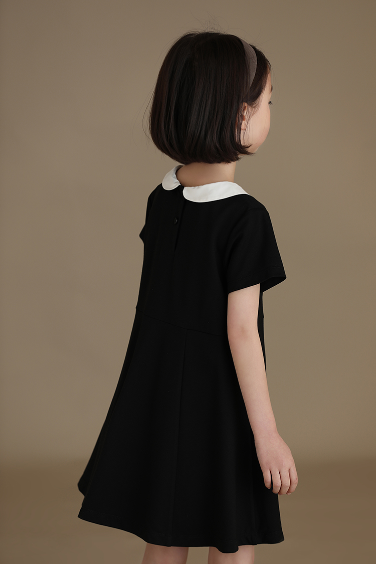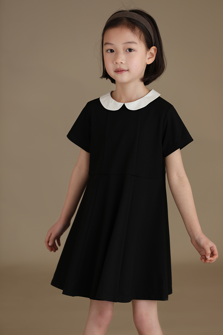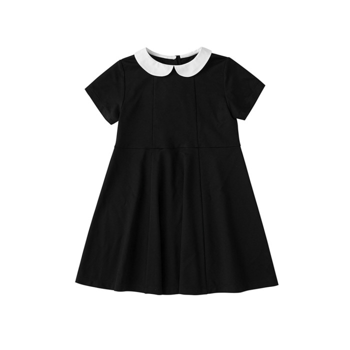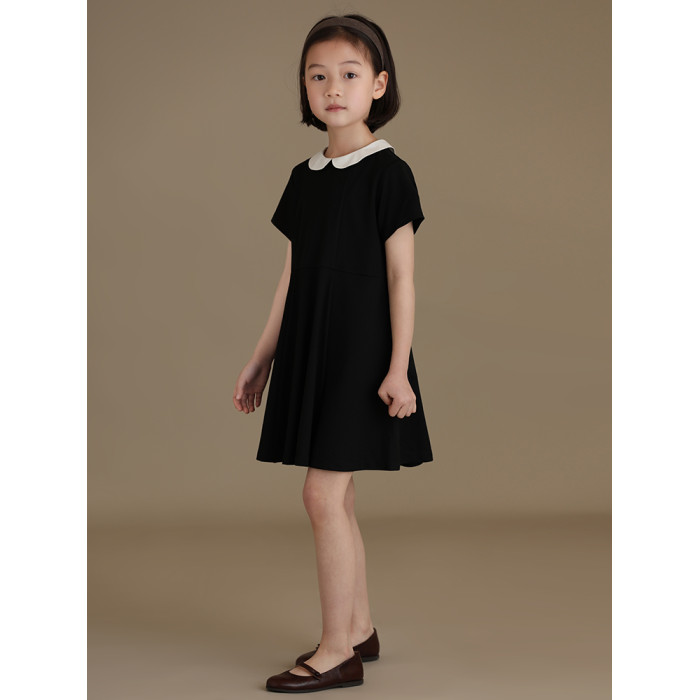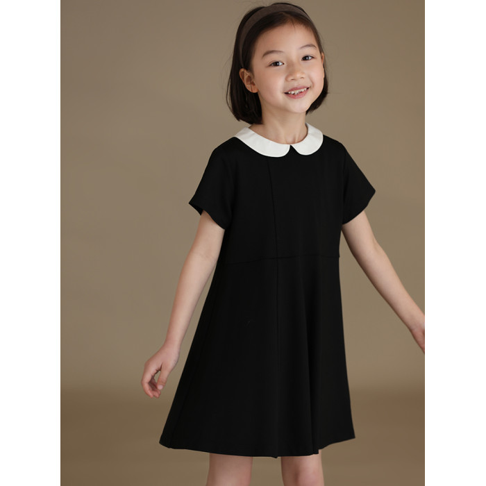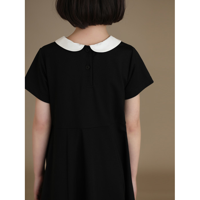 哈齒童裝新品女童親子款日系撞色拼接娃娃領黑色短袖連衣裙洋氣夏