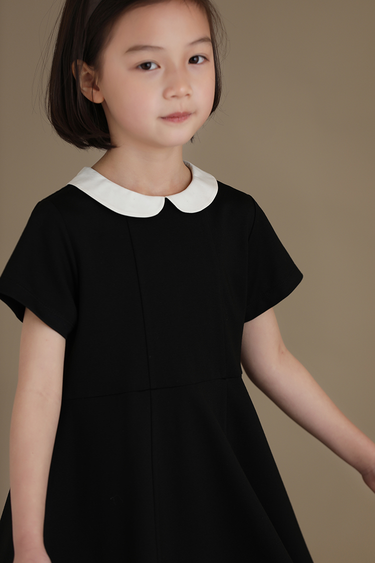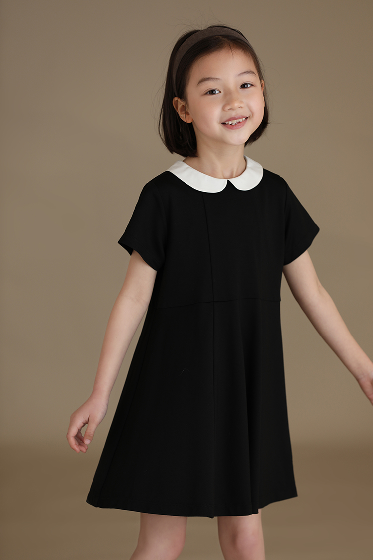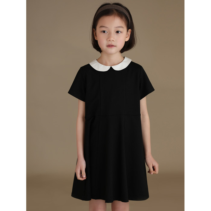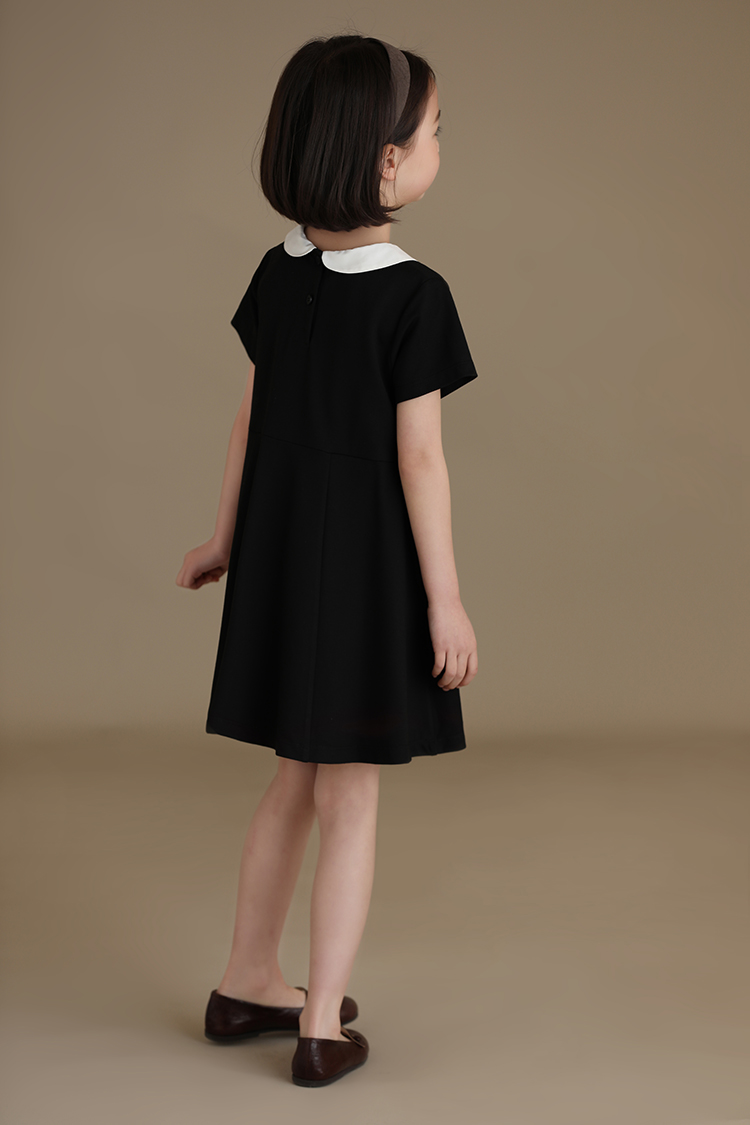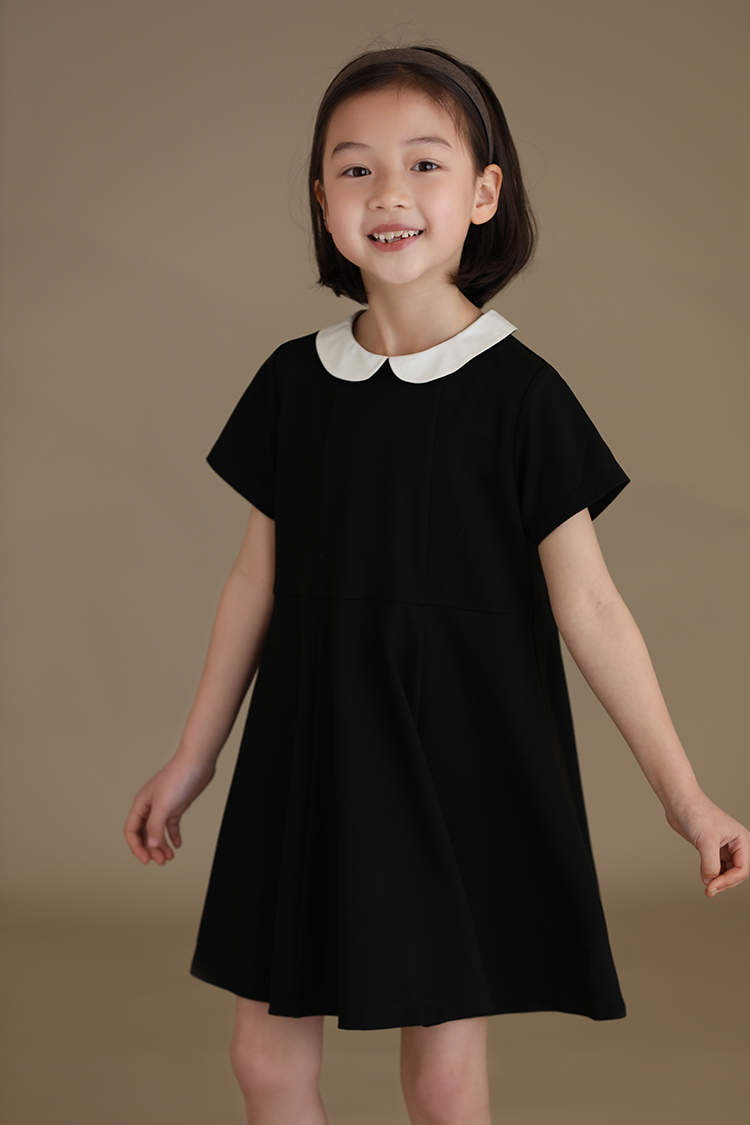 哈齒童裝新品女童親子款日系撞色拼接娃娃領黑色短袖連衣裙洋氣夏