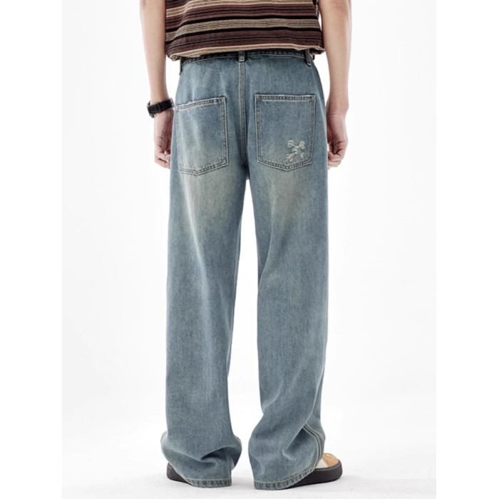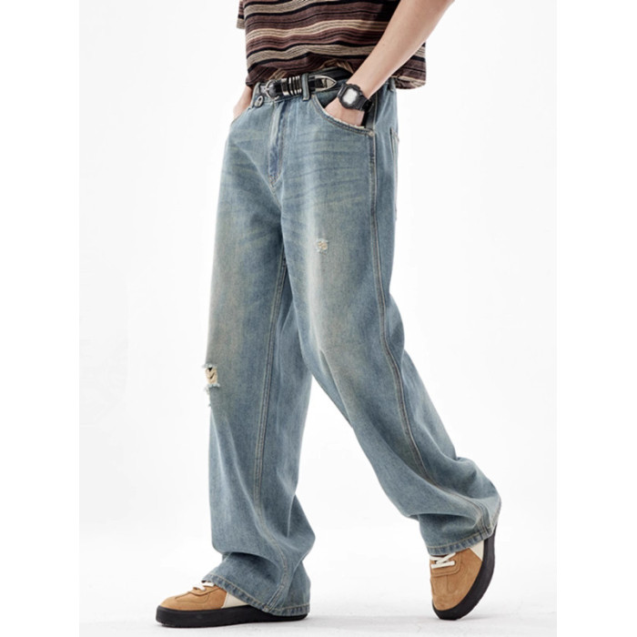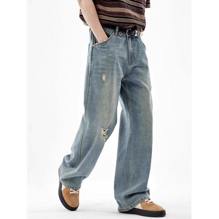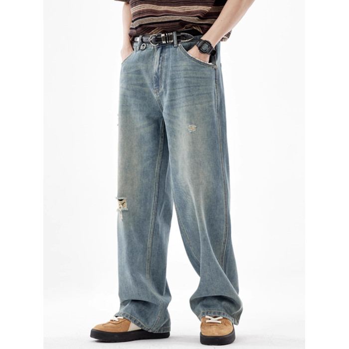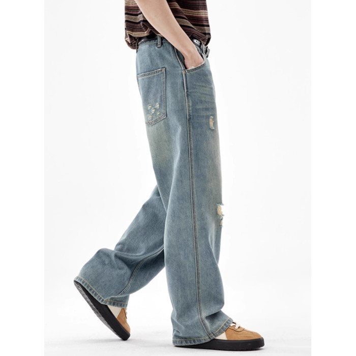 美式復古淺色破洞牛仔褲男2025夏季潮牌直筒寬松濶腿拖地休閒褲