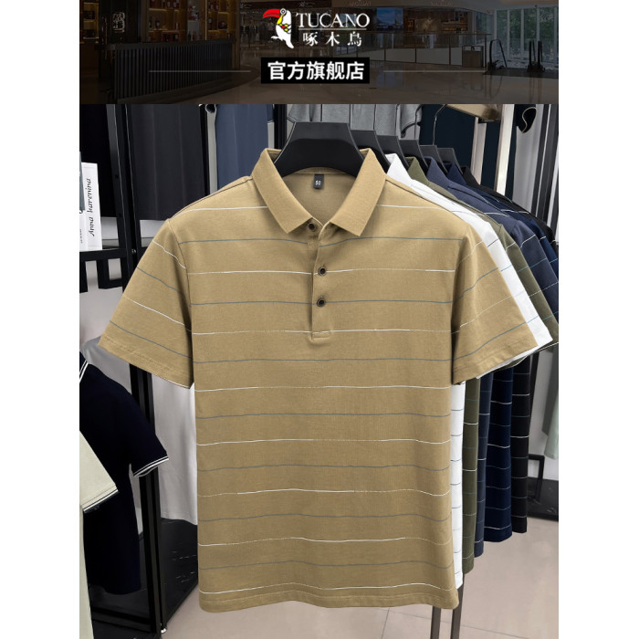 啄木鳥條紋翻領polo衫短袖夏裝男士薄款100%純棉t恤爸爸休閒上衣C