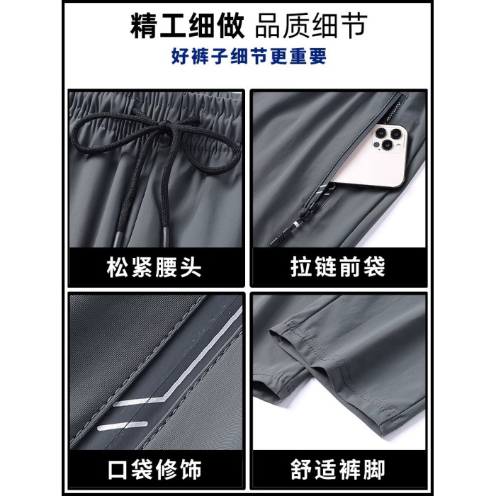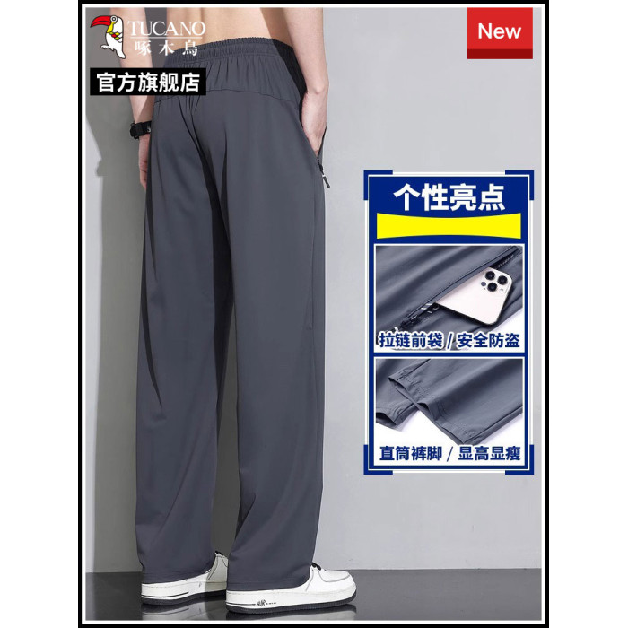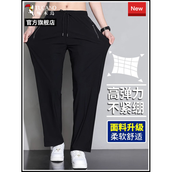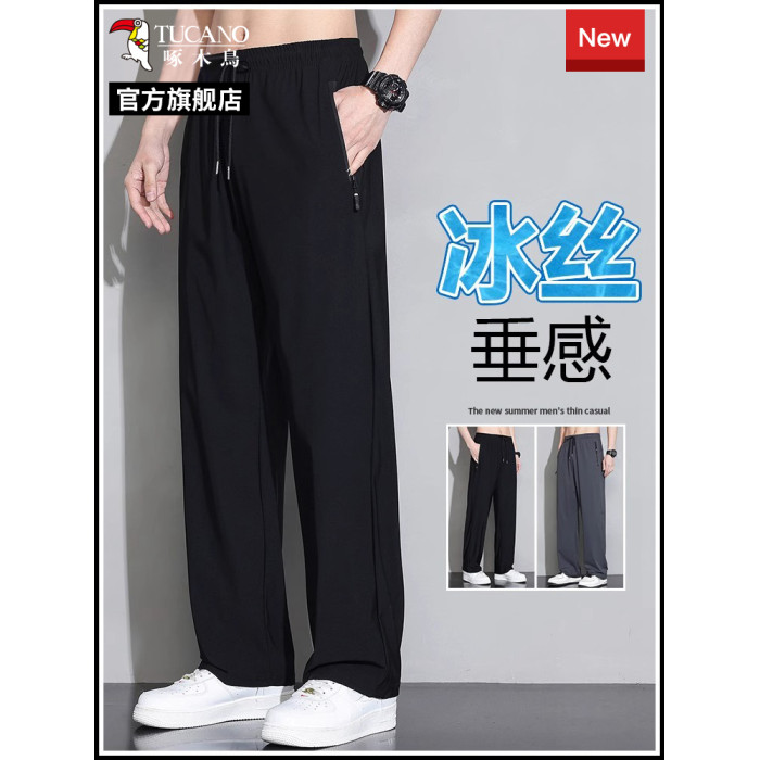 啄木鳥男士冰絲休閒褲夏季薄款垂感寬松直筒大碼運動濶腿長褲子Q