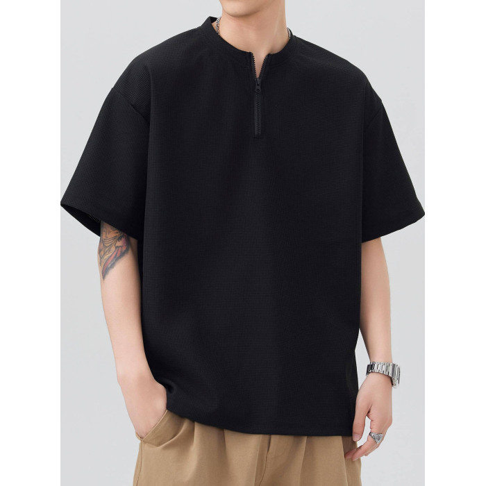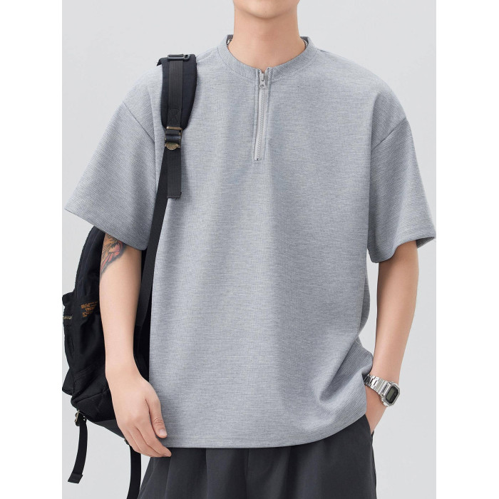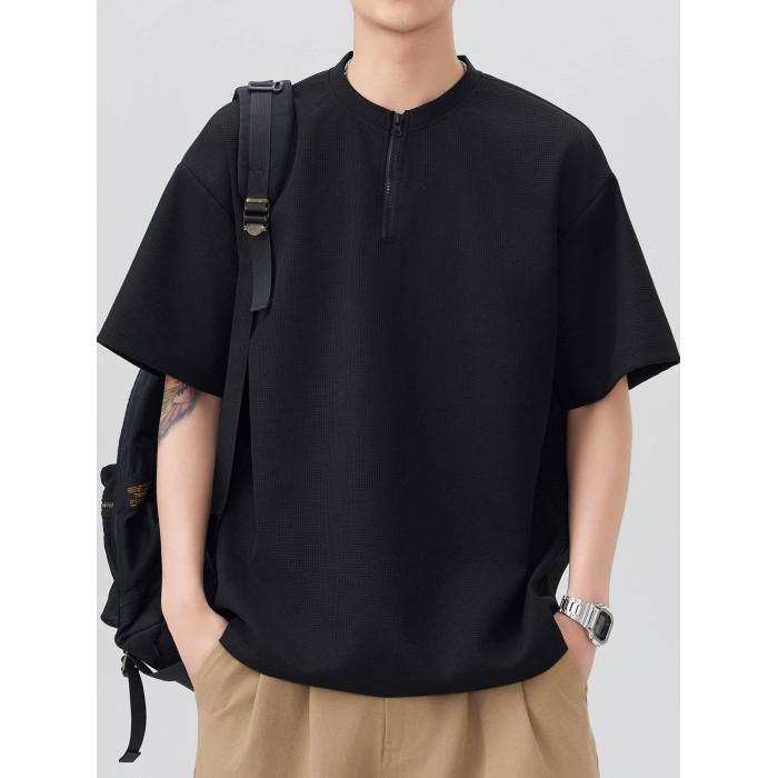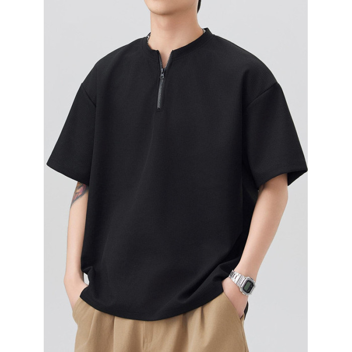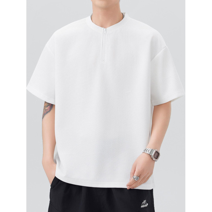 240g重磅華夫格短袖t恤男夏季薄款圓領休閒運動半拉鍊寬松體恤衫