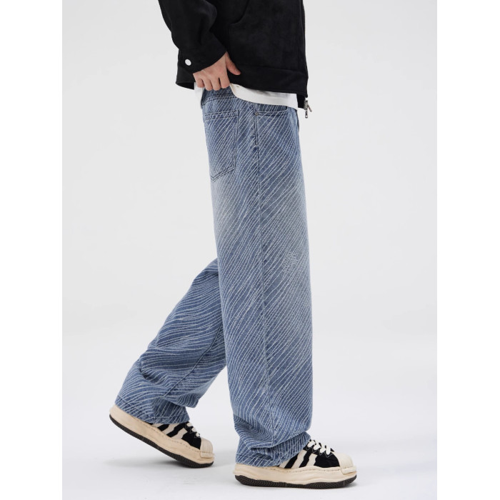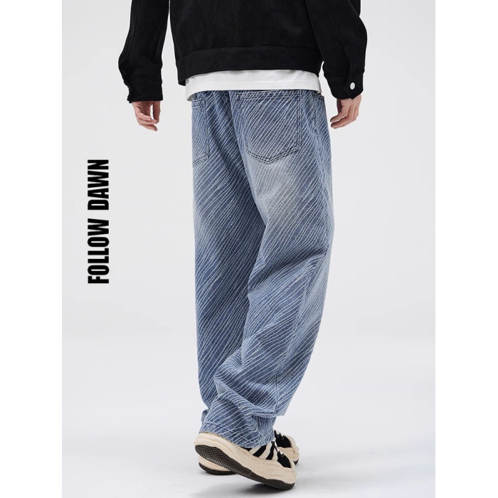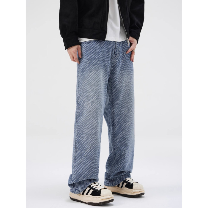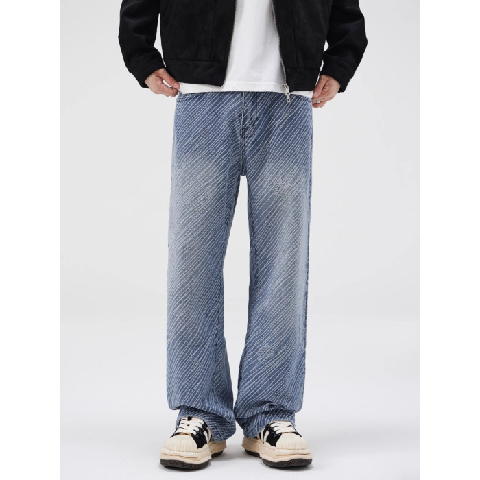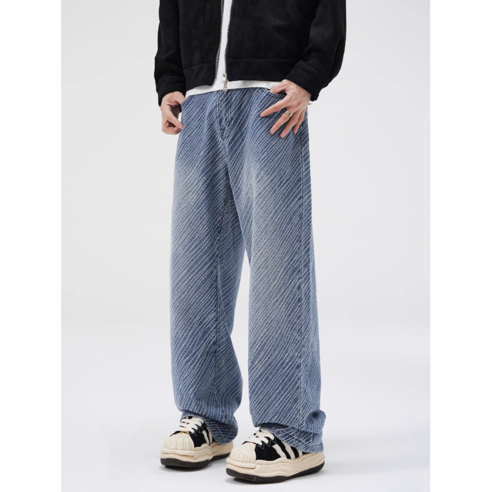 美式高街斜條紋牛仔褲男2025春季潮牌提花設計感寬松直筒長褲子