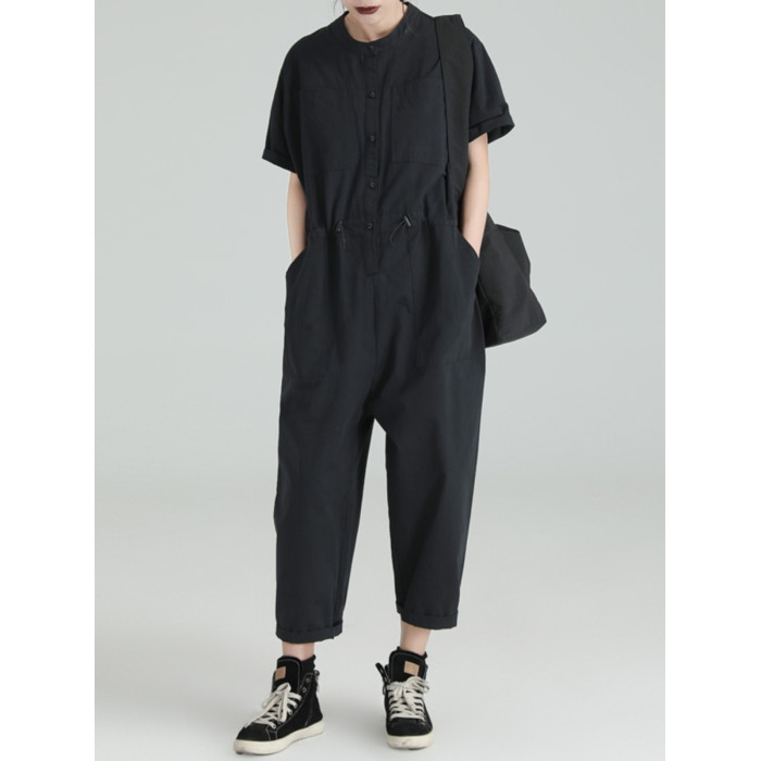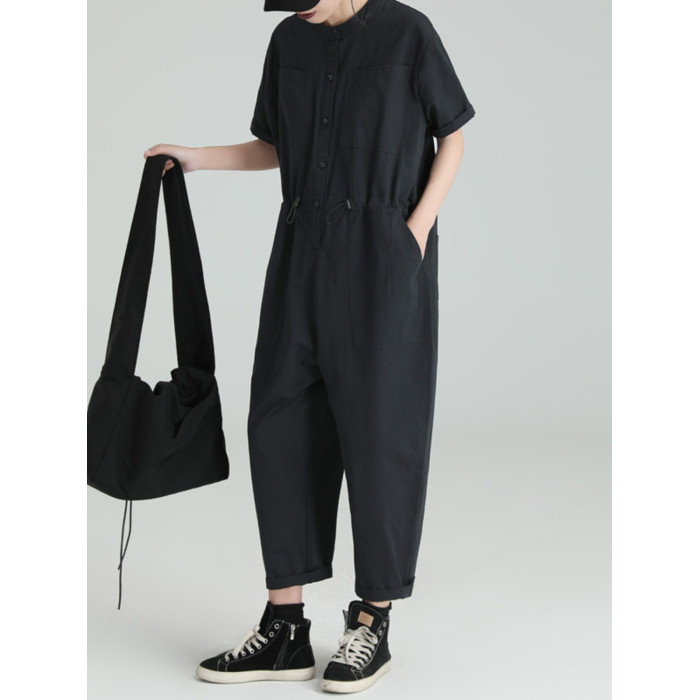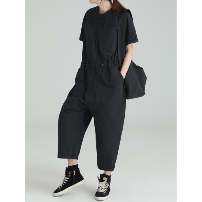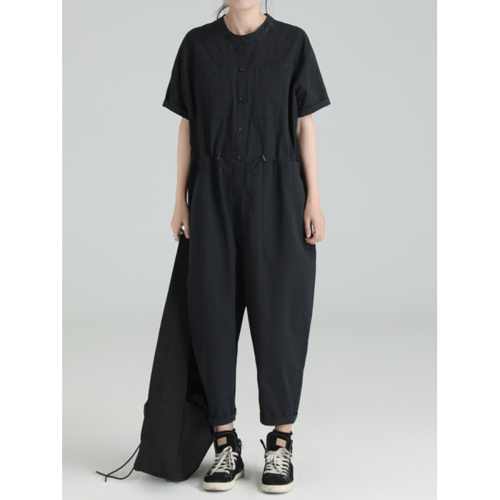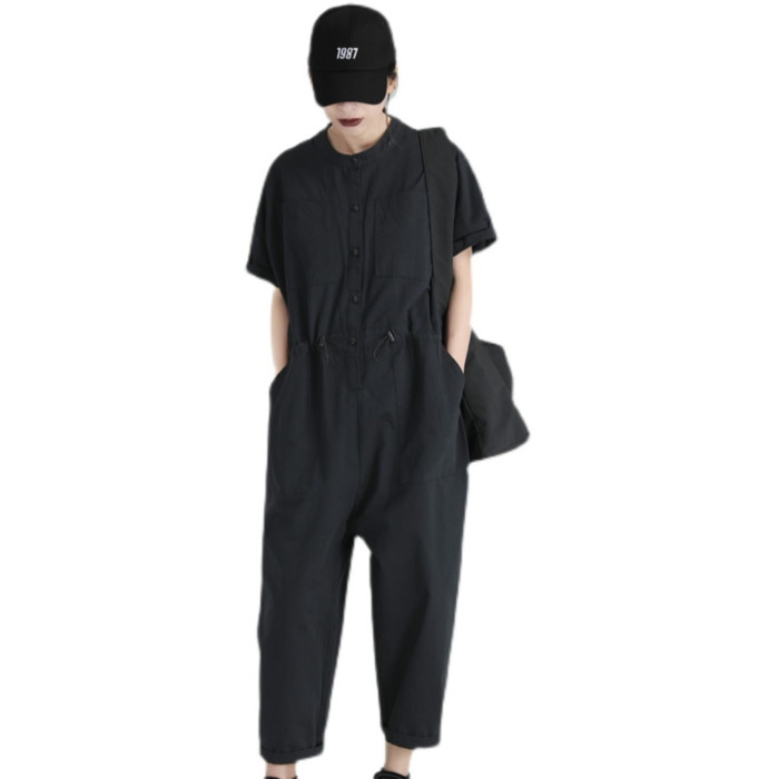 設計感小衆山本暗黑風短袖工裝連體褲女夏季休閒黑色連體衣濶腿褲