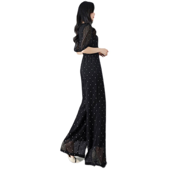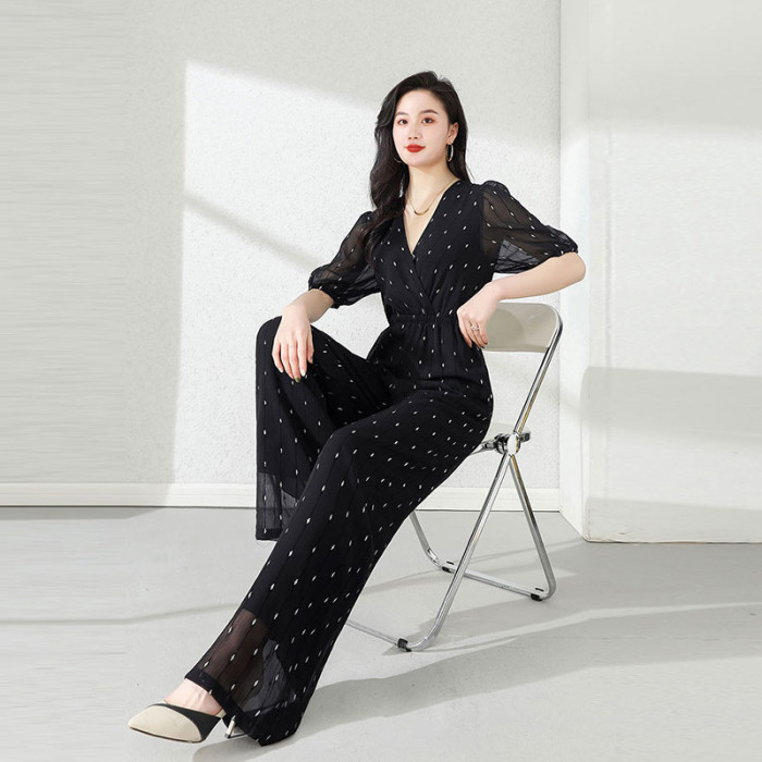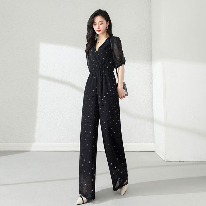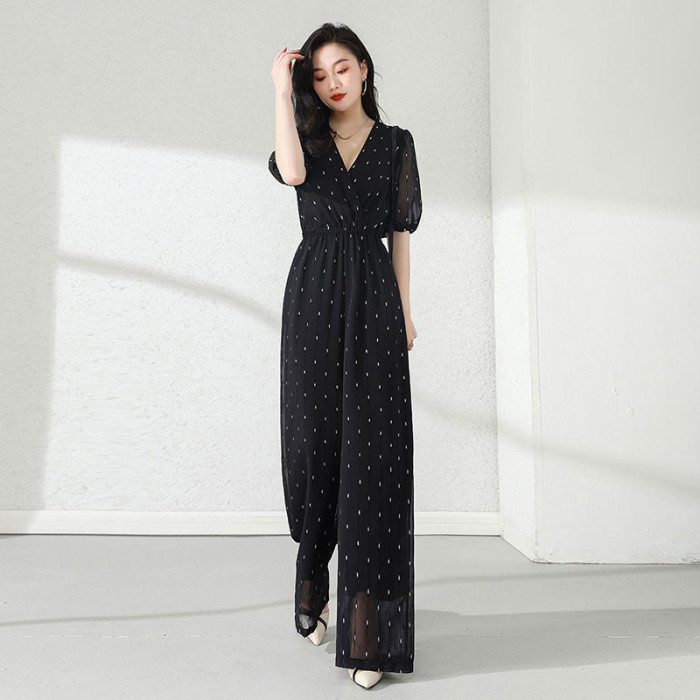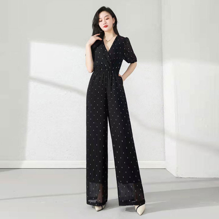 2024春夏新款連體褲高腰連體衣雪紡原創女V領顯瘦修身濶腿褲長褲