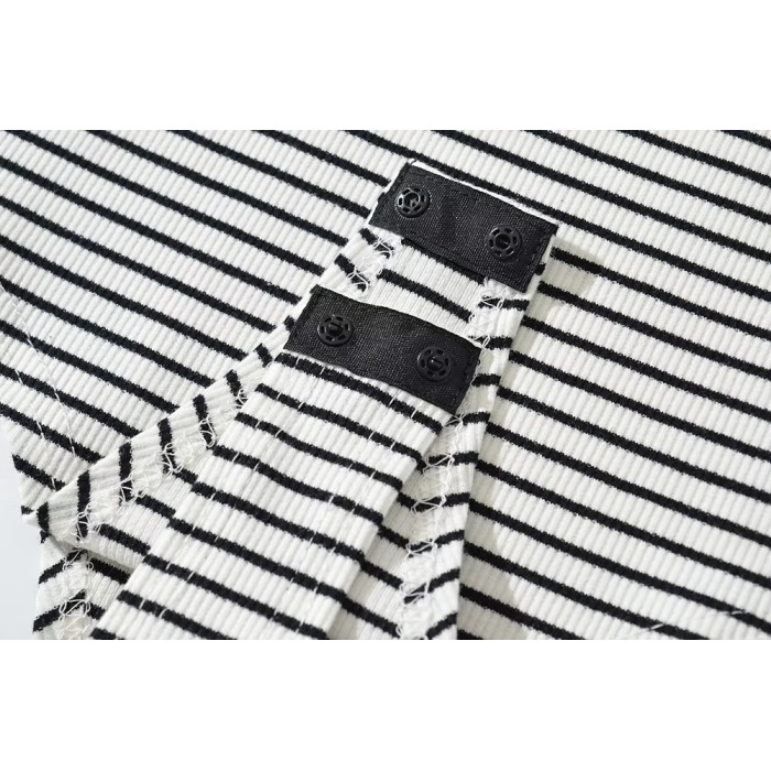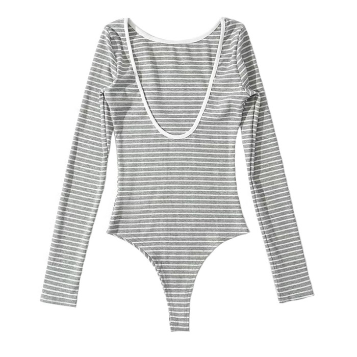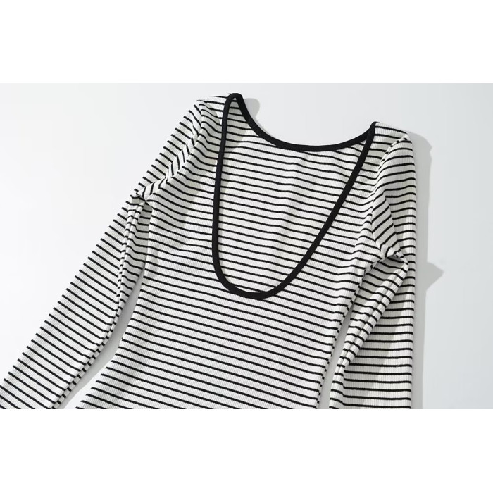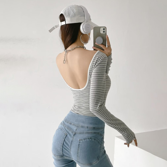 性感辣妹露背U領連體衣女外穿修身細條紋長袖連身t恤打底衫上衣潮