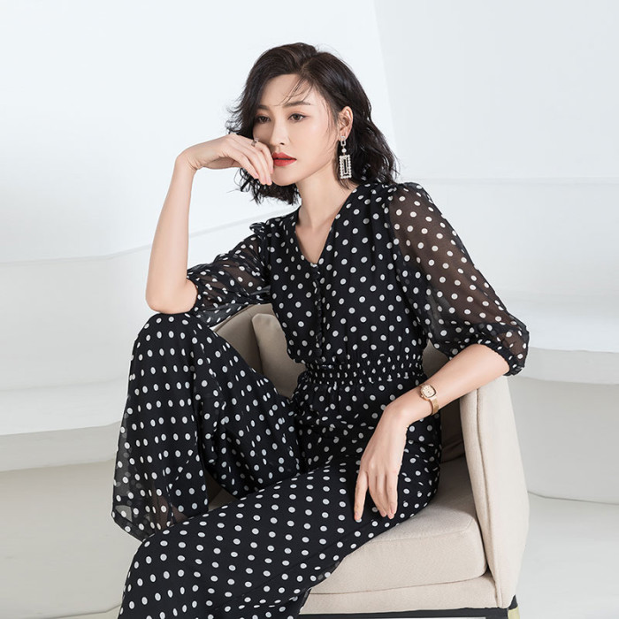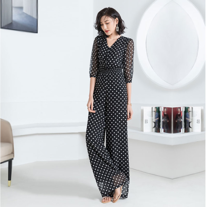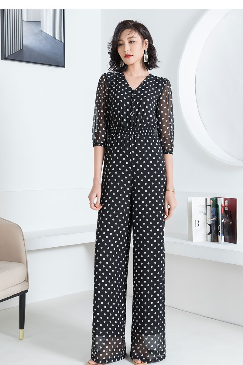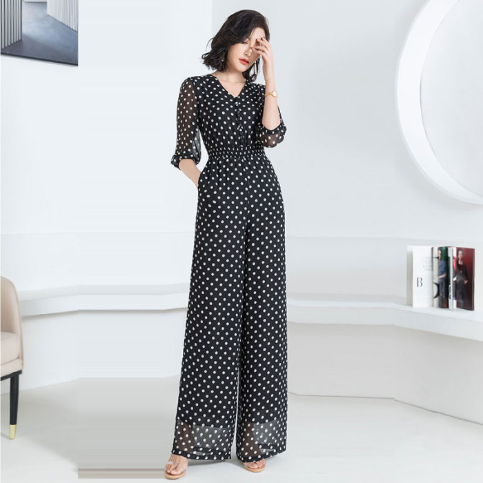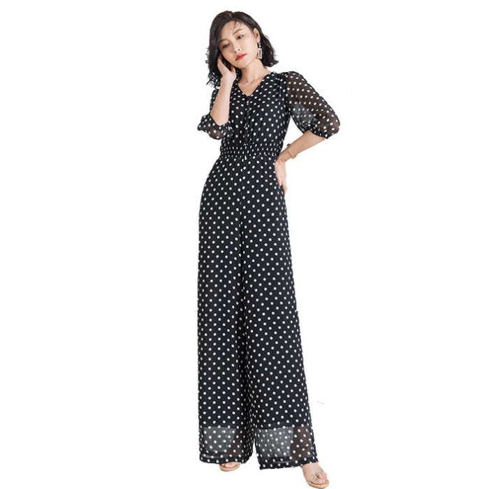 雪紡連體褲2024女夏季波點高腰原創修身濶腿長褲連體衣
