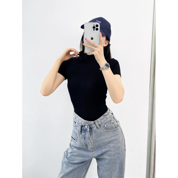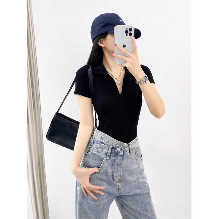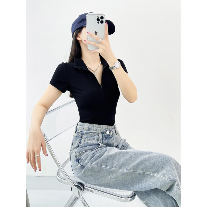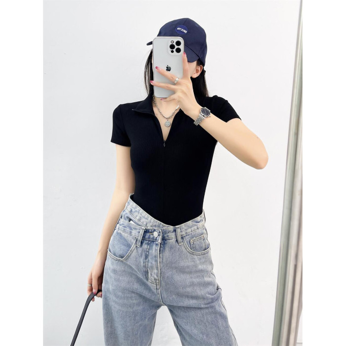 辣妹緊身立領拉鍊短袖連體衣女2024夏季外穿歐美連身上衣打底衫t