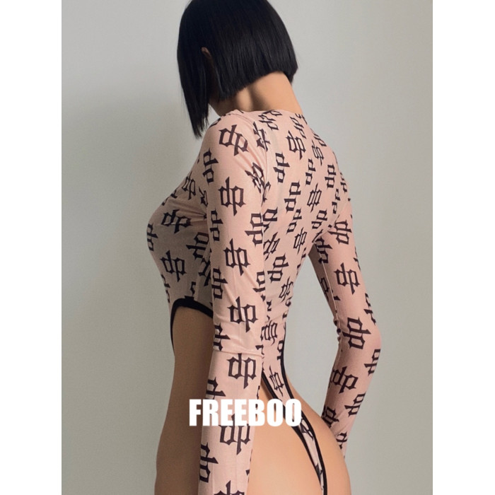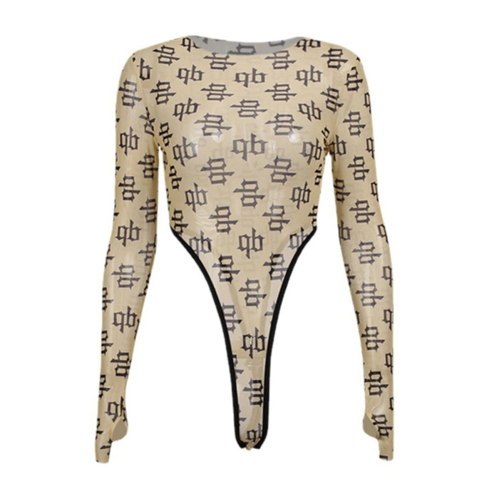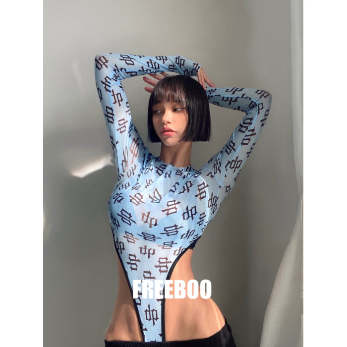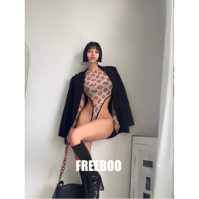 FREEBOO 透明針織印花長袖連體衣女韓系女裝春季性感修身上衣打底