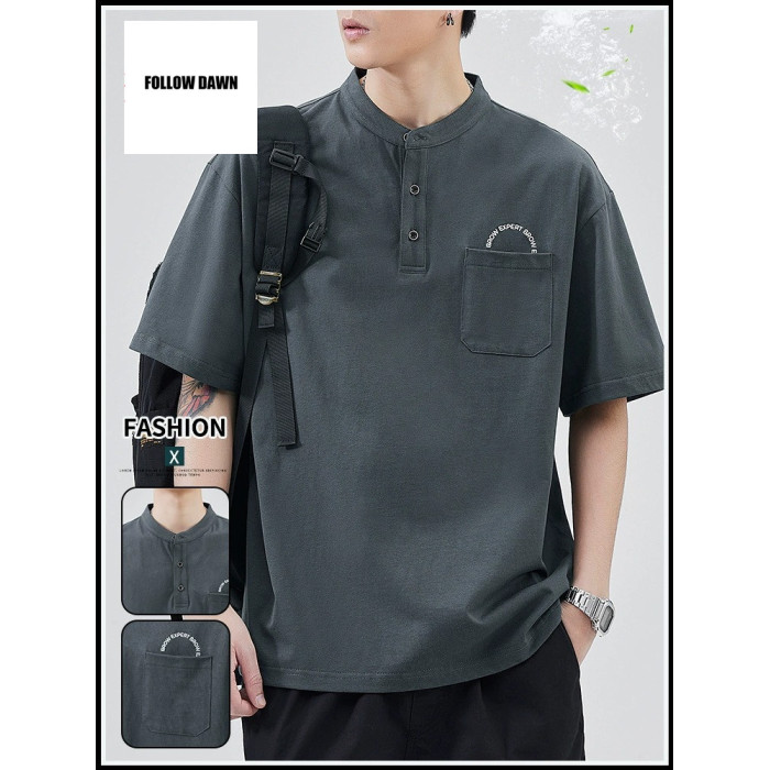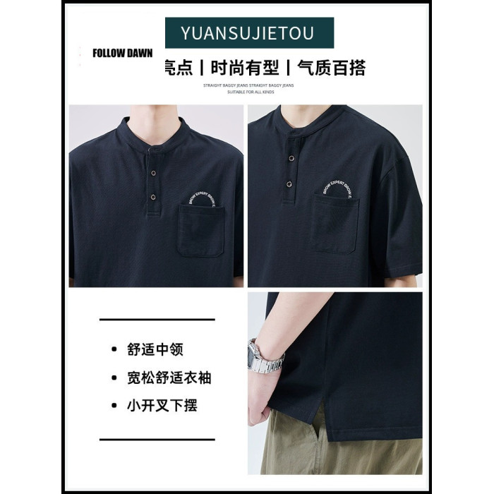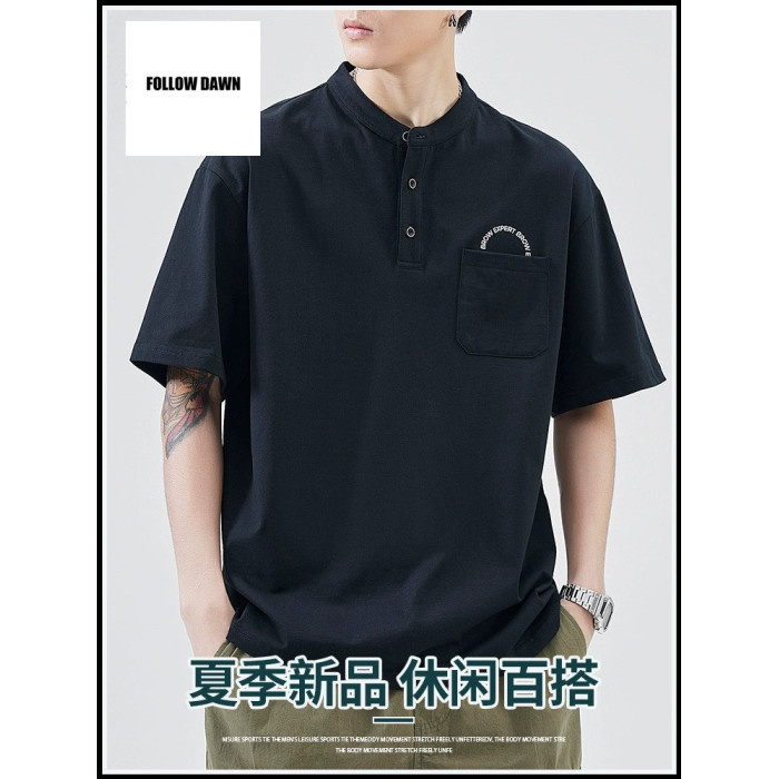 春夏季簡約純色T恤男寬松薄款亨利領美式復古純棉短袖上