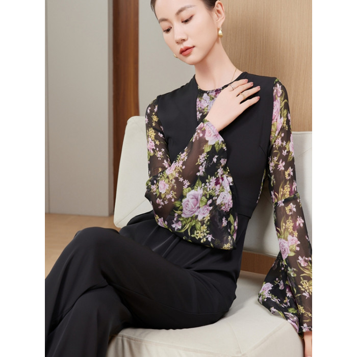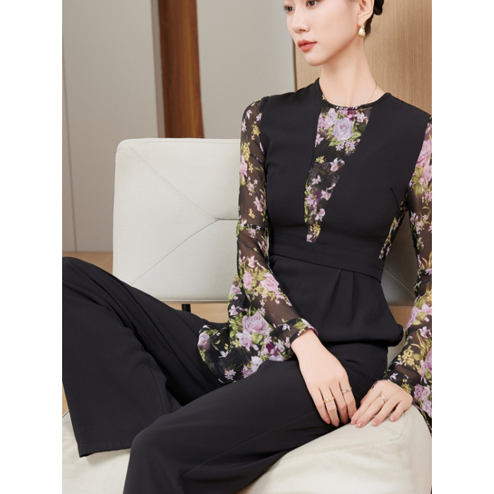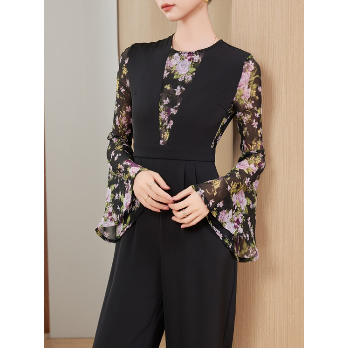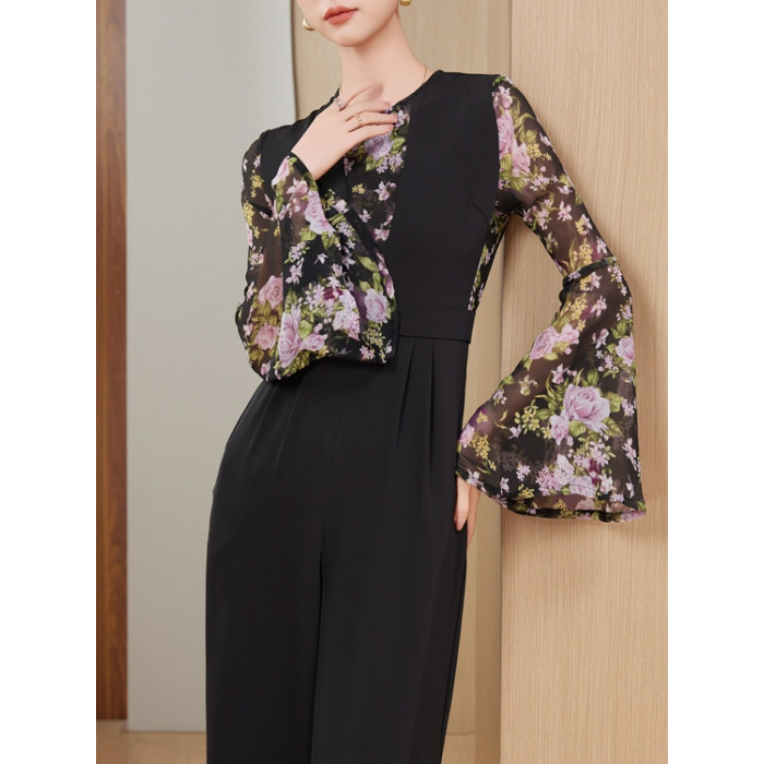 2025新款雪紡連體衣褲長袖長褲透視濶腿褲顯瘦直筒褲