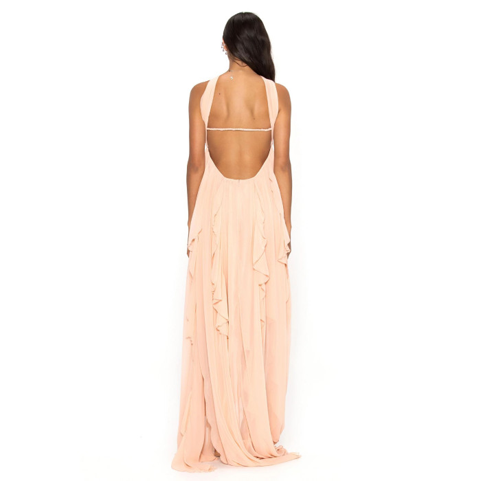 法式掛脖雪紡禮服裙性感裹胸露背星星裝飾不規則荷葉邊連衣裙長裙