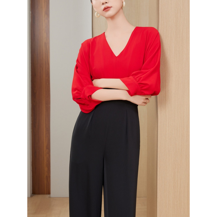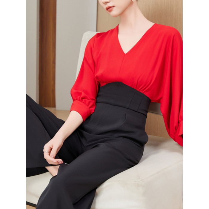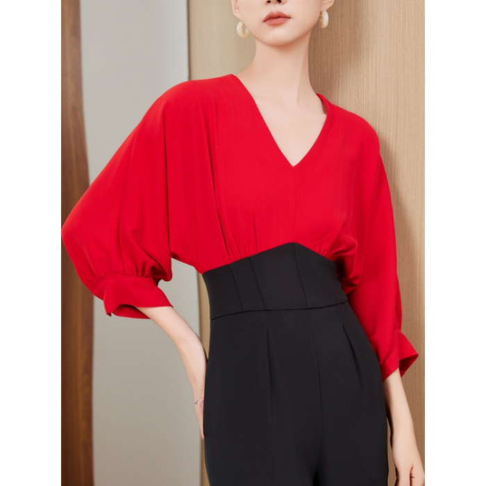 2025新款雪紡連體衣褲紅黑拼接氣質長褲修身顯瘦濶腿褲直筒褲