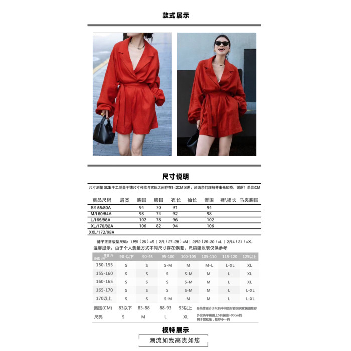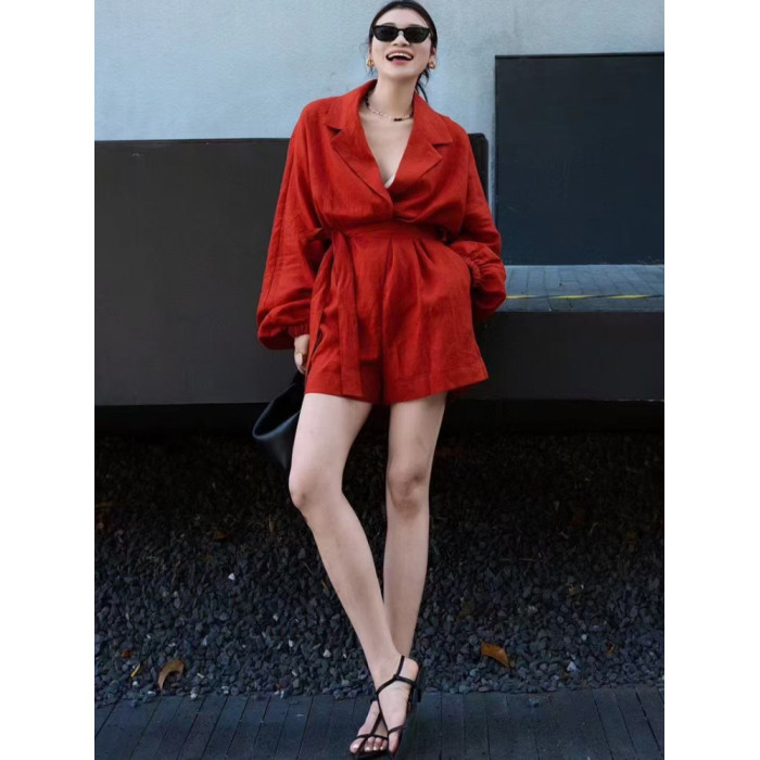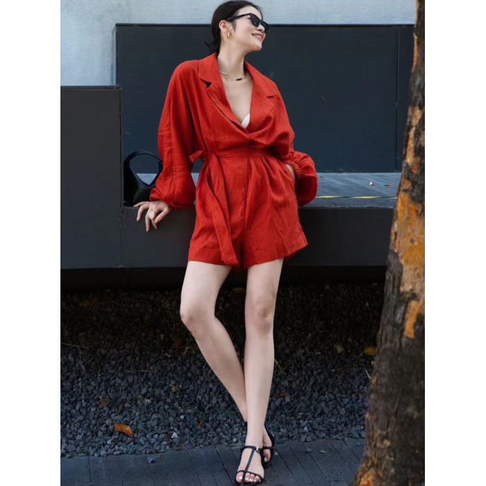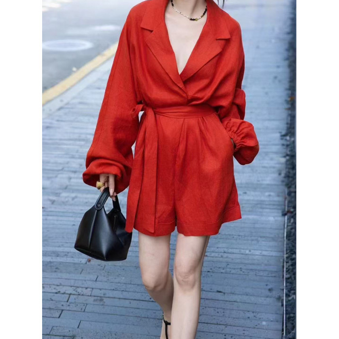 依萊寶夏季高級感100%亞麻西裝領系帶泡泡長袖小個子休閒連體衣褲