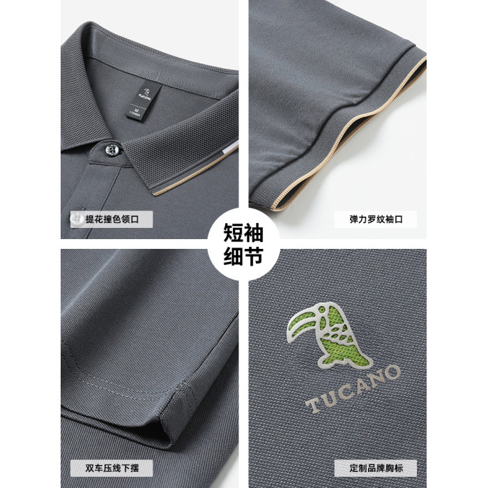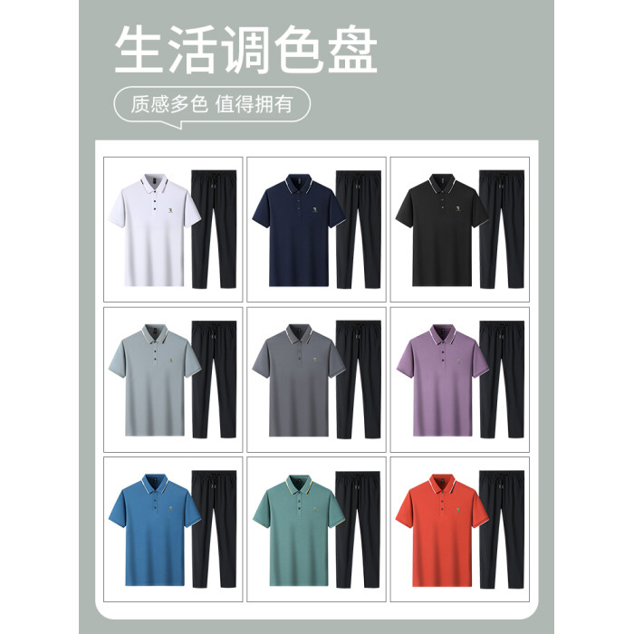 啄木鳥官方桑蠶絲夏季短袖polo衫男兩件套裝中年父親爸爸T恤衣服