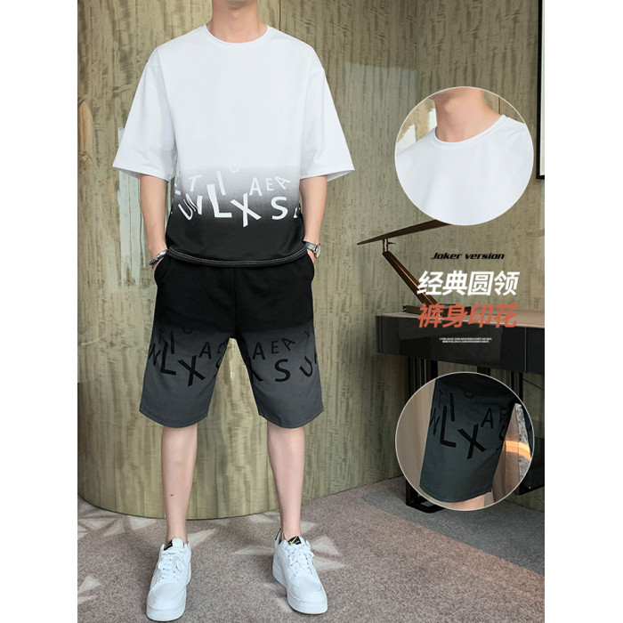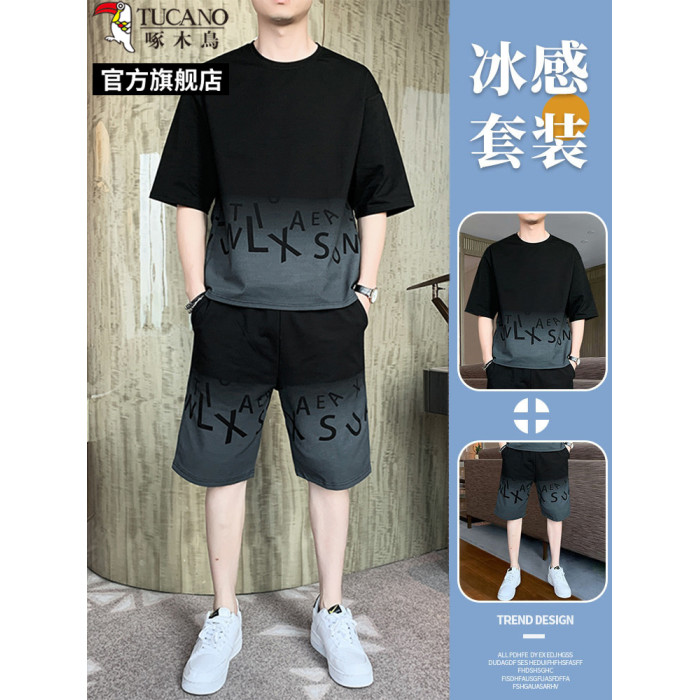 啄木鳥2025夏季新款休閒套裝男士短袖t恤短褲運動兩件套潮牌男裝L