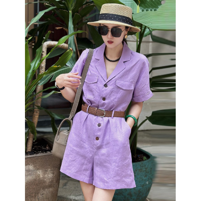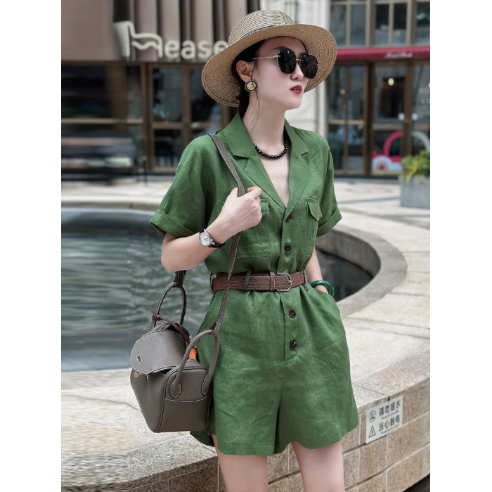 2025夏季新款休閒氣質翻領亞麻顯瘦連體衣女短袖濶腿連體褲短褲