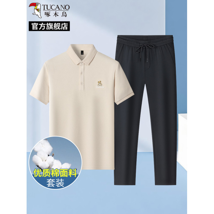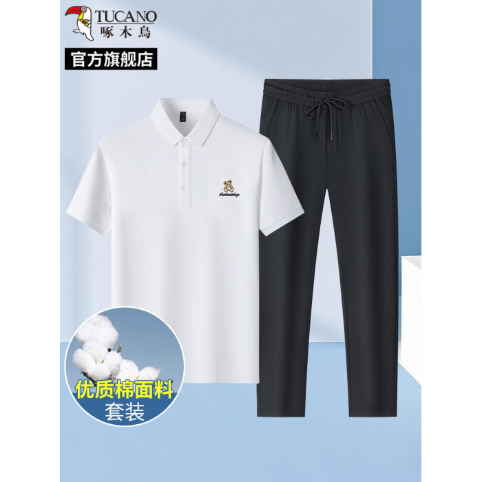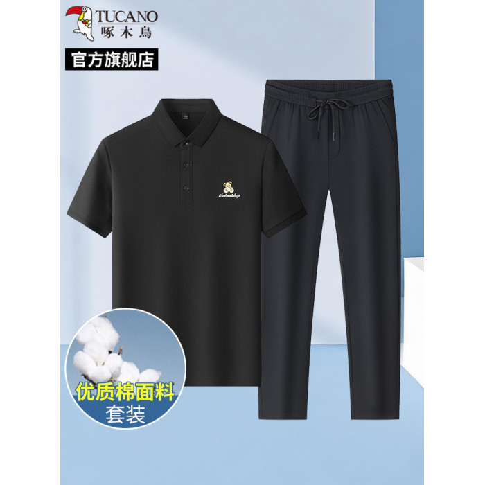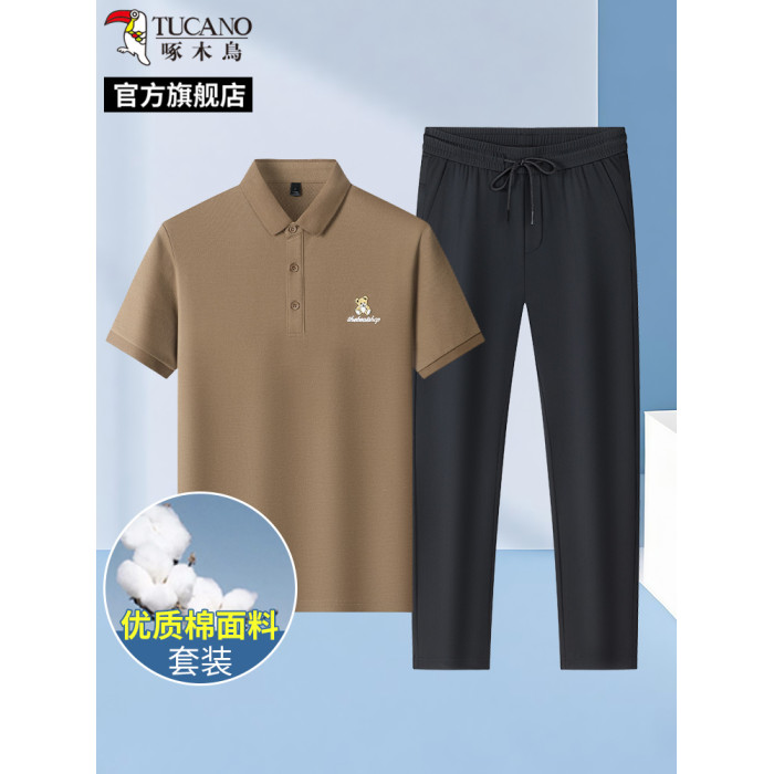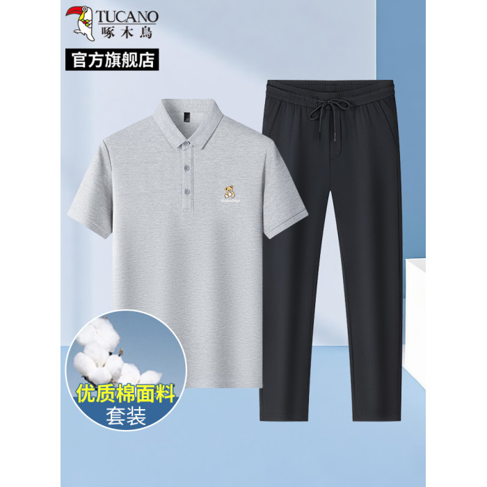 啄木鳥夏季珠地棉短袖POLO衫T恤+冰絲直筒休閒褲子爸爸男士套裝H