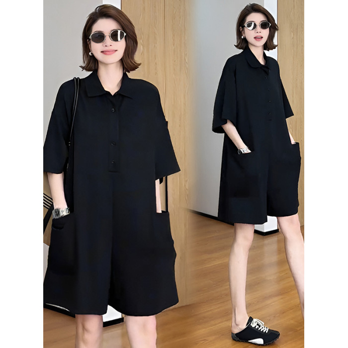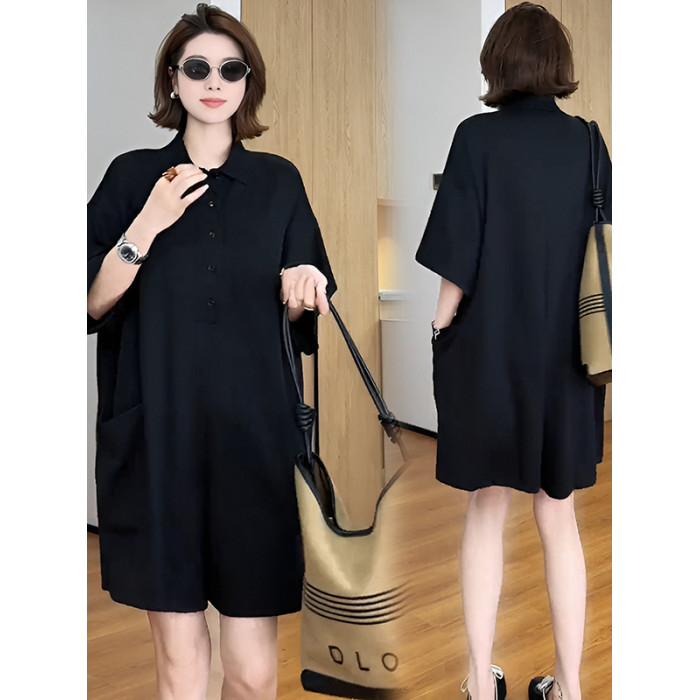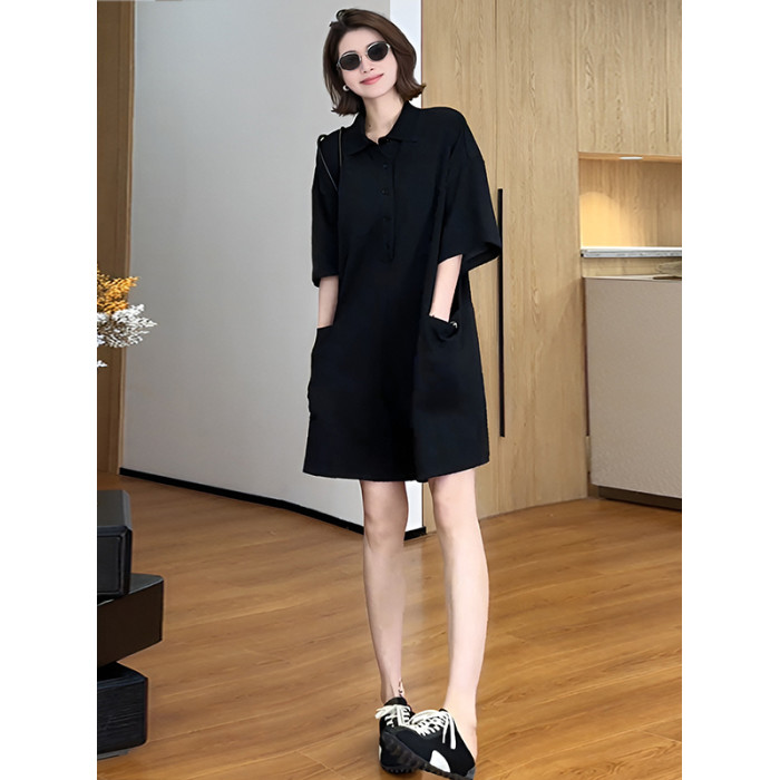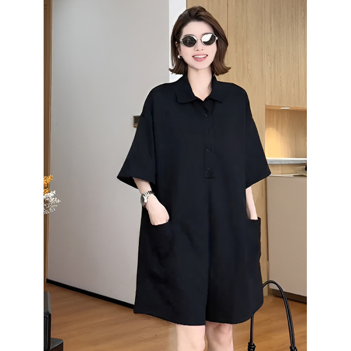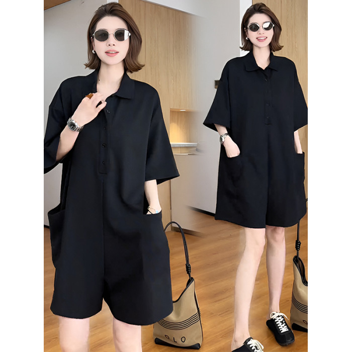 2025夏季新款韓版時尚氣質休閒百搭顯瘦短袖連體衣寬松翻領連體服